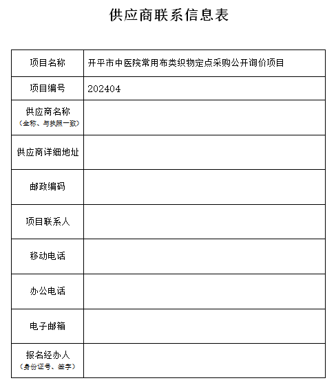 開平市中醫(yī)院因業(yè)務開展需要,開平市中醫(yī)院常用布類織物定點采購公開詢價,以確認定點采購供應商資格進行公開遴選,具體項目信息如下表: 我院將視具體報名情況再確定下一步工作計劃,本次公告的解釋權(quán)歸我開平市中醫(yī)院所有。 特此公告。 開平市中醫(yī)院招標采購工作小組 2024年4月19日 附:供應商聯(lián)系信息表 【下載】 202404開平市中醫(yī)院常用布類織物定點采購詢價項目院內(nèi)自主招標公告.doc 202404開平市中醫(yī)院常用布類織物定點采購詢價項目供應商報名表.doc 來源:開平市中醫(yī)院