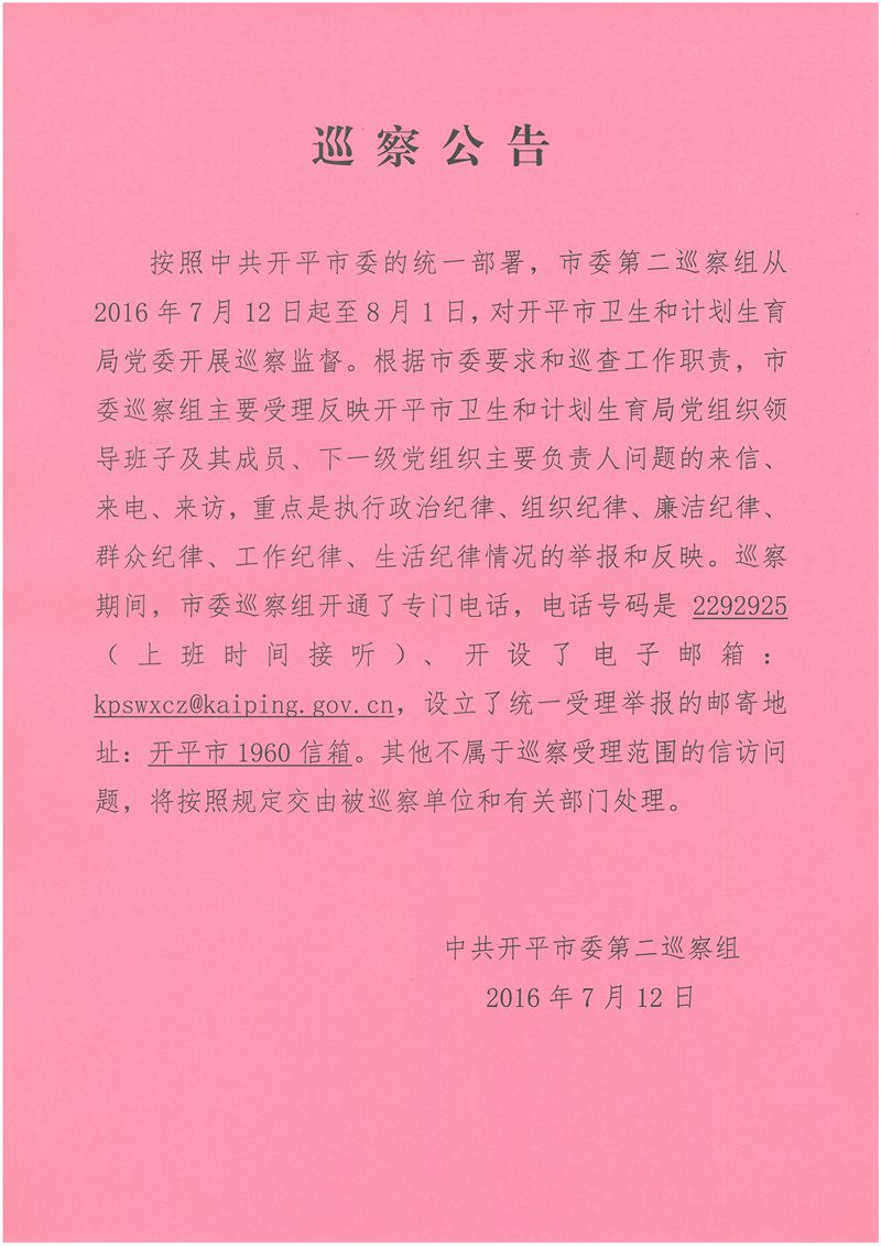 【7-12至8-1】【巡察公告】市委巡察組對開平市衛(wèi)生計生局黨委開展巡察監(jiān)督