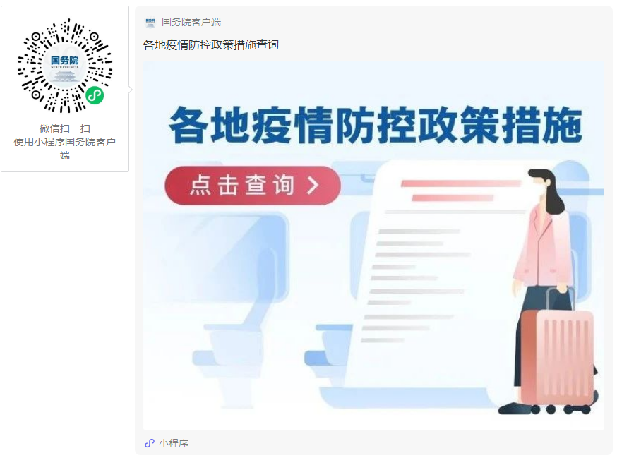 滯留人員來(lái)(返)粵請(qǐng)注意 在當(dāng)?shù)匾迅綦x14天,持當(dāng)?shù)亟獬綦x證明和48小時(shí)內(nèi)核酸陰性證明 抵粵后開(kāi)展“四個(gè)一”健康管理和14天自我健康監(jiān)測(cè)。 抵粵后持48小時(shí)內(nèi)核酸陰性證明 自行做好個(gè)人防護(hù)回家,根據(jù)旅居史調(diào)查情況,配合當(dāng)?shù)匾咔楣芾泶胧?/p> 抵粵后無(wú)48小時(shí)內(nèi)核酸陰性證明 通過(guò)火車或飛機(jī)抵粵:在交通站場(chǎng)立即采樣,根據(jù)旅居史,配合當(dāng)?shù)匾咔楣芾泶胧?/p> 通過(guò)陸路等其他交通工具抵粵:第一時(shí)間向社區(qū)報(bào)備,立即前往附近核酸檢測(cè)點(diǎn)進(jìn)行采樣檢測(cè)。 長(zhǎng)按識(shí)別葵花碼 查詢附近核酸檢測(cè)機(jī)構(gòu) 乘坐從涉疫地區(qū)專機(jī)或?qū)A蟹祷?/strong> 在抵達(dá)當(dāng)?shù)亟煌ㄕ緢?chǎng)時(shí)立即采樣。 抵粵時(shí)無(wú)48小時(shí)內(nèi)核酸陰性證明:待采樣核酸結(jié)果出來(lái)后方能離開(kāi)交通站場(chǎng)。 抵粵時(shí)持48小時(shí)內(nèi)核酸陰性證明:在交通站場(chǎng)采樣后做好個(gè)人防護(hù)自行回家。 根據(jù)旅居史,配合當(dāng)?shù)匾咔楣芾泶胧?/p> 長(zhǎng)按識(shí)別葵花碼 查詢最新中高風(fēng)險(xiǎn)地區(qū)名單 “有同時(shí)空交集”暴露史重點(diǎn)人群 完成交通站場(chǎng)采樣后,按照“7+7”(7天居家隔離+7天居家健康監(jiān)測(cè))開(kāi)展健康管理,其中第1、3、7和14天核酸檢測(cè)。 一圖讀懂 (點(diǎn)擊圖片可放大) 疫情變化下 跨地區(qū)流動(dòng)要做核酸檢測(cè)嗎? 寒假、春節(jié)有返鄉(xiāng)需要 各地最新防疫政策怎么快速查? 用它!?? 國(guó)務(wù)院客戶端小程序上線了 “各地疫情防控政策措施”查詢服務(wù) 該服務(wù)由31個(gè)?。ㄗ灾螀^(qū)、直轄市) 和新疆生產(chǎn)建設(shè)兵團(tuán)聯(lián)防聯(lián)控機(jī)制提供相關(guān)數(shù)據(jù) 點(diǎn)擊或長(zhǎng)按葵花碼 即可一鍵查詢各地出行政策 戳視頻,手把手教你怎么用! 點(diǎn)擊卡片?? 出行政策一鍵查! 其他查詢方式 ● 你還可以打開(kāi)百度、支付寶,掃描對(duì)應(yīng)的二維碼,查詢出行政策。 百度掃一掃 支付寶掃一掃 另外,為方便大家第一時(shí)間掌握防控政策變化,國(guó)務(wù)院客戶端小程序“各地疫情防控政策措施”查詢服務(wù)增加了“訂閱”功能,訂閱后一旦該地區(qū)防控政策發(fā)生變化,你將馬上收到微信通知。 操作非常簡(jiǎn)單,只需要兩步。 01 點(diǎn)擊進(jìn)入“各地疫情防控政策措施”查詢服務(wù),選擇出發(fā)地和目的地。 02 在地區(qū)右側(cè)點(diǎn)擊“訂閱變動(dòng)”即可訂閱該地疫情防控政策變化。 當(dāng)所訂閱地區(qū)防控政策發(fā)生變化時(shí),你將在微信的服務(wù)通知里收到提醒。 示意圖↓ 小提示 1. 如果對(duì)防控政策有疑問(wèn),可以點(diǎn)“防疫咨詢電話”,進(jìn)行電話咨詢。 2. 拉到底部還有防疫行程卡、風(fēng)險(xiǎn)等級(jí)查詢等常用疫情服務(wù),供你不時(shí)之需。 點(diǎn)擊進(jìn)入↓ 廣大市民請(qǐng)注意 1、請(qǐng)盡量避免前往中高風(fēng)險(xiǎn)地區(qū)或有病例報(bào)告的區(qū)域,日常要堅(jiān)持做好勤洗手、戴口罩、勤通風(fēng)、一米線這“防疫四件套”。 2、每天進(jìn)行自我健康監(jiān)測(cè),如有出現(xiàn)發(fā)熱、干咳、乏力、咽痛、嗅(味)覺(jué)減退、腹瀉等不適癥狀時(shí),盡早到附近醫(yī)院發(fā)熱門診就診,并告知醫(yī)生旅居史,不要自行用藥;就醫(yī)途中全程佩戴口罩,避免乘坐公共交通工具。 3、在沒(méi)有接種禁忌癥的情況下,符合條件的市民盡快接種新冠病毒疫苗。 來(lái)源:廣東疾控、網(wǎng)信江門