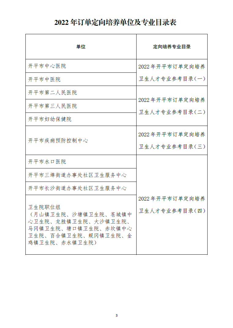 【下載】2022年開平市訂單定向培養(yǎng)衛(wèi)生人才計劃50名.docx 青春無悔 醫(yī)路有你 讀書每年補(bǔ)助兩萬還保編制,畢業(yè)直接到我市醫(yī)療機(jī)構(gòu)工作! --2022年開平市訂單定向培養(yǎng)衛(wèi)生人才計劃50名! 有這樣一群人,他們每天都在救死扶傷;有這樣一群人,他們每天都在與時間賽跑;有這樣一群人,他們每天都在迎接新的生命。他們守護(hù)的是人民的健康,追求的是患者滿意,堅持的是醫(yī)者仁心。你是否也想成為他們的一員,成為開平人民的健康守門人?請馬上閱讀開平市訂單定向培養(yǎng)衛(wèi)生人才計劃! 一、對象:參加2022年全國普通高等學(xué)校招生統(tǒng)一考試,報考專業(yè)符合我市醫(yī)療衛(wèi)生機(jī)構(gòu)緊缺崗位醫(yī)學(xué)類專業(yè)(具體專業(yè)范圍由市衛(wèi)生健康部門、市人才辦每年根據(jù)全市醫(yī)療機(jī)構(gòu)對衛(wèi)生專業(yè)技術(shù)人員實際需求確定,詳見《2022年訂單定向培養(yǎng)單位及專業(yè)目錄表》)要求,被成功錄取為本科(含本科、本碩連讀、本碩博連讀),且志愿在開平市從事醫(yī)療衛(wèi)生工作的開平市戶籍,在廣東省參加全國普通高等學(xué)校招生統(tǒng)一考試的考生;江門市戶籍或非江門市戶籍,但在江門市參加全國普通高等學(xué)校招生統(tǒng)一考試的考生。每年定向培養(yǎng)人數(shù)50人。 二、主要權(quán)利: 1.補(bǔ)助標(biāo)準(zhǔn):20000元/年/人(補(bǔ)助年限以大學(xué)錄取通知書上錄取專業(yè)正常學(xué)習(xí)時限為準(zhǔn),每學(xué)年期初發(fā)放到定向培養(yǎng)生銀行賬戶)。 2.按照規(guī)定時間畢業(yè),由市衛(wèi)生健康部門按照競爭擇優(yōu)的原則經(jīng)相關(guān)程序錄用到醫(yī)療衛(wèi)生機(jī)構(gòu)工作。 3.定向培養(yǎng)醫(yī)學(xué)生正常畢業(yè)后可以選擇更高學(xué)歷繼續(xù)學(xué)習(xí)(繼續(xù)學(xué)習(xí)期間不予補(bǔ)助),完成更高學(xué)歷學(xué)習(xí)后按協(xié)議履行義務(wù)。 三、主要義務(wù): 1.定向培養(yǎng)醫(yī)學(xué)生在獲取入學(xué)通知書后,須簽署定向培養(yǎng)衛(wèi)生人才協(xié)議書,承諾畢業(yè)后到開平市有關(guān)醫(yī)療衛(wèi)生機(jī)構(gòu)服務(wù)6年以上。 2.定向培養(yǎng)醫(yī)學(xué)生畢業(yè)后,按有關(guān)規(guī)定參加相關(guān)培訓(xùn),并完成對應(yīng)專業(yè)醫(yī)學(xué)從業(yè)人員資格考試。 3.定向培養(yǎng)醫(yī)學(xué)生畢業(yè)后未按協(xié)議到醫(yī)療衛(wèi)生機(jī)構(gòu)工作,或出現(xiàn)其他違約事項,按規(guī)定退還已享受的補(bǔ)助費用并繳納違約金。同時將違約事實記入個人誠信檔案。 “健康所系,性命相托”,他們堅持人民至上、生命至上,堅決守護(hù)全市人民生命安全和身體健康,用他們的負(fù)重前行換來我們?nèi)腥嗣竦臍q月靜好。他們的堅持需要你們的接力,家鄉(xiāng)人民的健康需要你們的守護(hù),請報考醫(yī)學(xué)專業(yè)吧,與我們簽約,“醫(yī)”起向未來! (聯(lián)系人:開平市衛(wèi)生健康局人事股司徒小姐,聯(lián)系電話:2252002、2251833,辦公地點:開平市長沙街道東興大道人和東路12號5幢) 開平市衛(wèi)生健康局 2022年6月9日