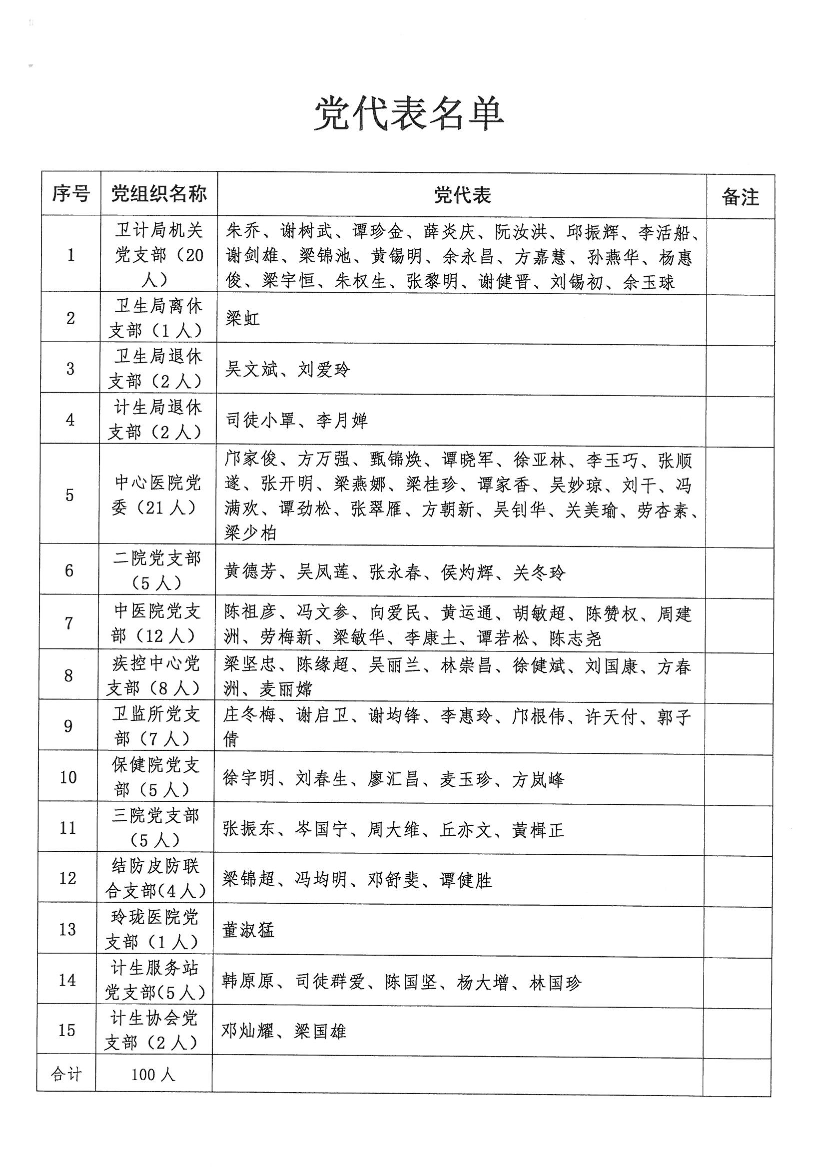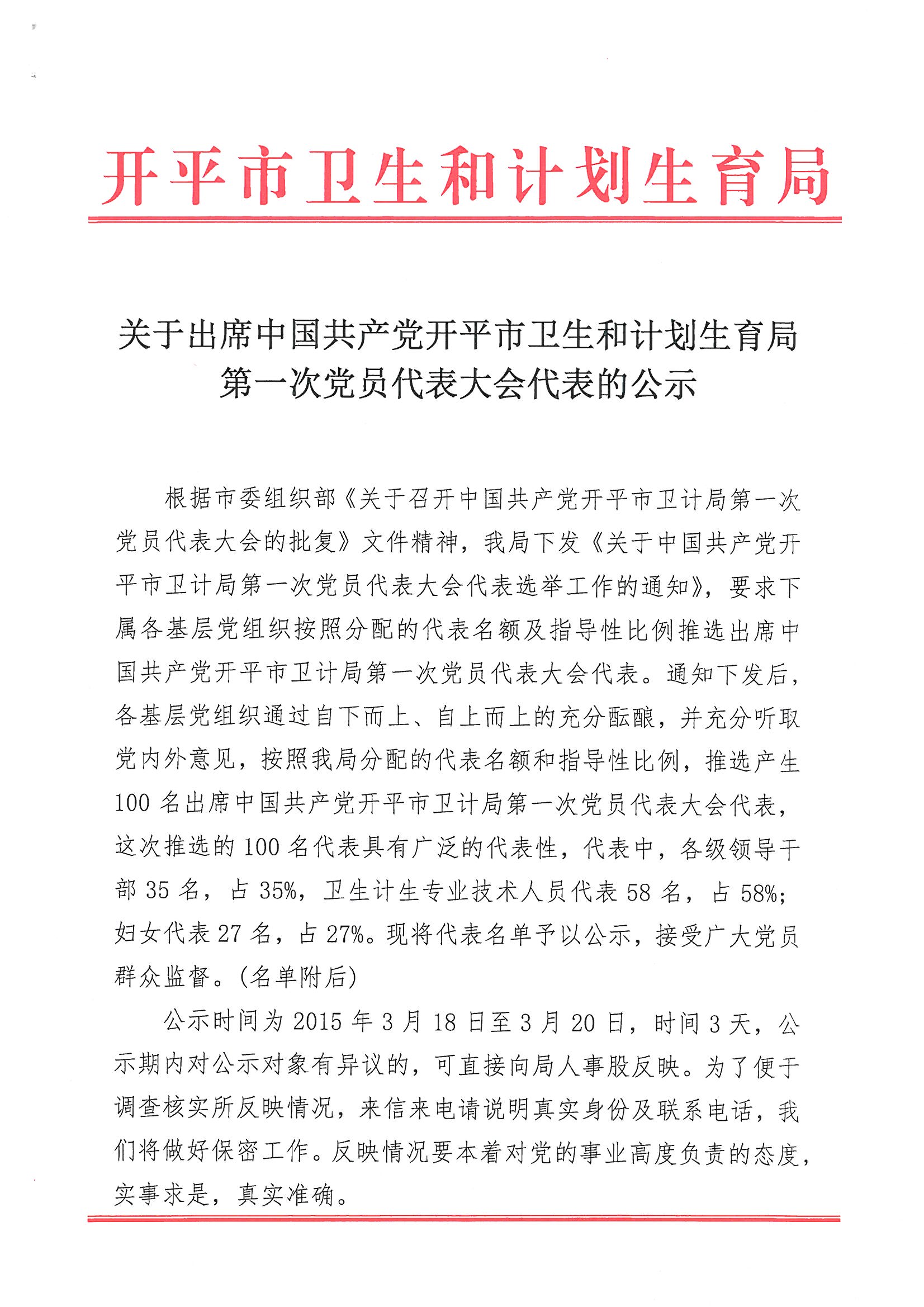 關于出席中國共產黨開平市衛(wèi)生和計劃生育局第一次黨員代表大會代表的公示