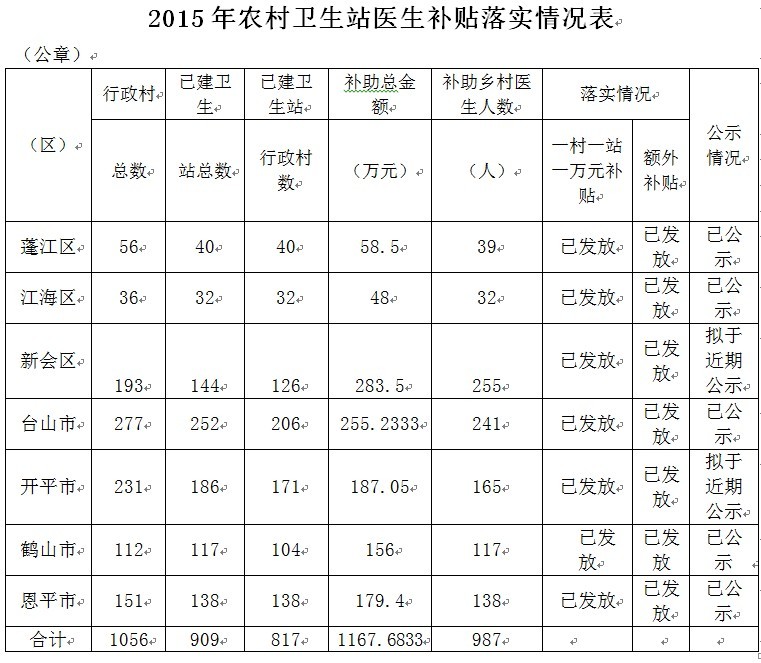 2015年我市共對817個行政村的987名鄉(xiāng)村醫(yī)生發(fā)放補貼1167.6萬元。補貼資金落實情況和領取補貼的鄉(xiāng)村醫(yī)生名單在江門市及各市、區(qū)衛(wèi)生和計劃生育局網站上公示,接受社會監(jiān)督。如對補貼情況有異議,請向江門市衛(wèi)生和計劃生育局反映,反映情況的書面材料或電話要用真實姓名,并請留下聯(lián)系電話,以便受理。