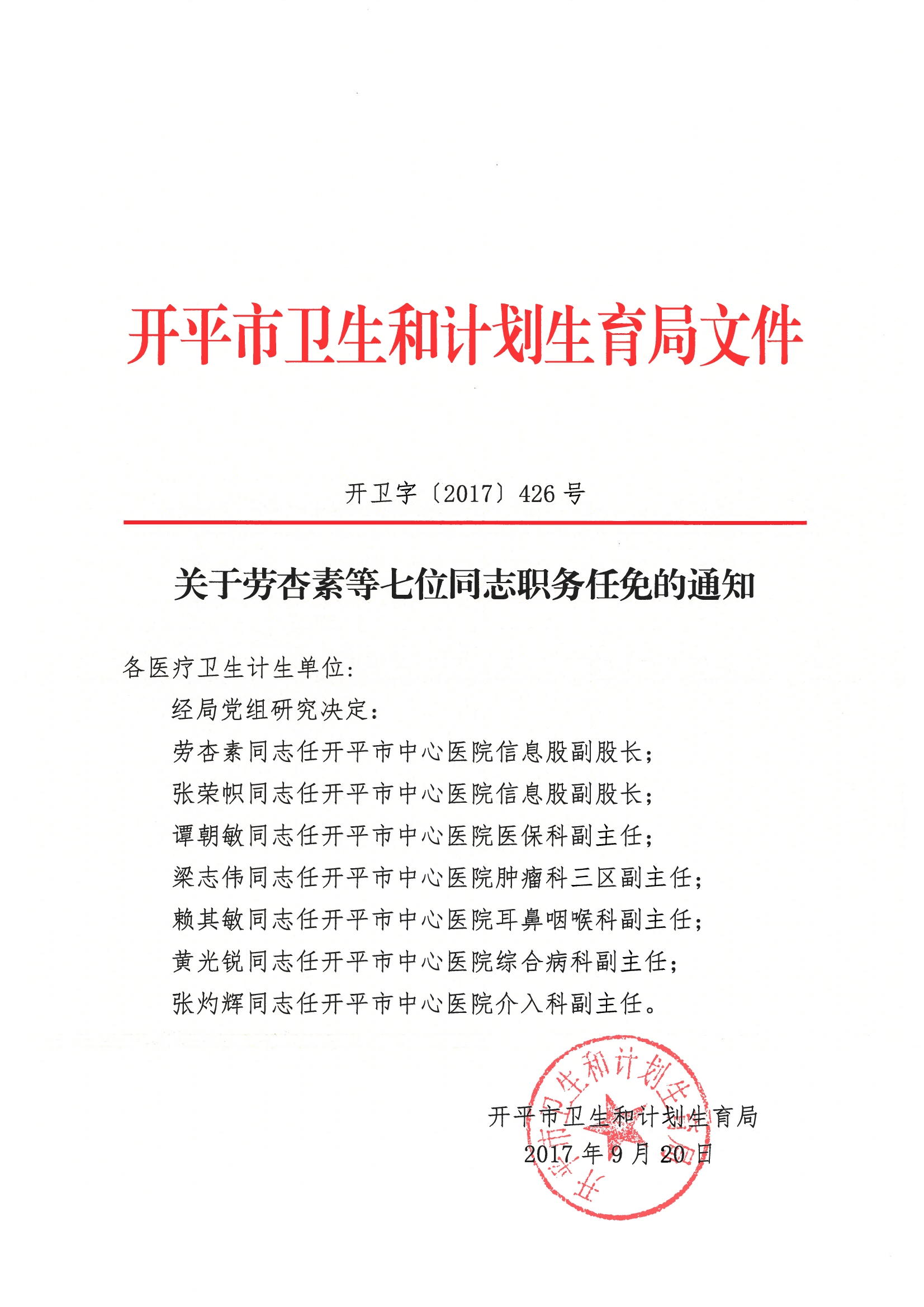 關(guān)于勞杏素等七位同志職務(wù)任免的通知(開衛(wèi)字〔2017〕426號)