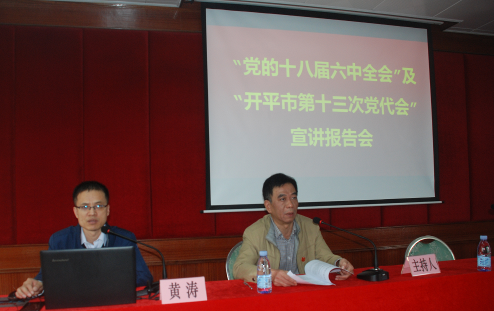 學習會邀請開平市委黨校教研室主任、開平市委“黨的十八屆六中全會”及“開平市第十三次黨代會”精神宣講團成員黃濤老師作了宣講報告。黃濤老師從黨的十八屆六中全會的重大意義、全面加強和規(guī)范黨內政治生活、全面落實黨內監(jiān)督責任等三個層面,對黨的十八屆六中全會精神進行了深入分析和詳細解讀。同時圍繞開平市第十三次黨代會提出指導思想和奮斗目標,形象生動地分析解讀了黨代會精神,并對落實黨代會精神提出了很好的思路和方法。報告既有理論的高度,又緊密結合實際;既圍繞中心,又突出重點,對于全體干部系統學習全會精神和黨代會精神,深刻領會全面從嚴治黨的新思想、新論斷、新舉措,具有重要指導意義。