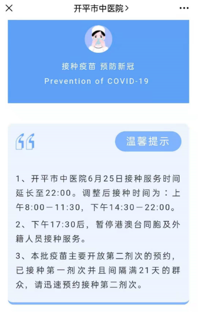 重要通知 廣大市民: 根據(jù)上級工作安排,我市將在6月底前完成本階段新冠疫苗第二劑次接種任務(wù),清庫清零。請已接種第一針滿21天的廣大市民迅速到原接種點接種第二針。7月1日后新冠疫苗接種工作安排將會有調(diào)整。 為了確保已接種第一針滿21天的廣大市民能在6月底前完成接種第二針,實施錯峰接種,避免高峰期扎堆排隊,我市各疫苗接種點將向第一針次疫苗接種已滿21天的市民群眾發(fā)出提醒信息,收到信息的可在2天內(nèi)免預(yù)約到該接種點接種。同時,也可以在每天晚上7點通過粵苗APP、粵健通微信小程序進行預(yù)約接種。 開平市衛(wèi)生健康局 2021年6月24日 @廣大市民,請知悉 第一針尚未產(chǎn)生足夠免疫保護 要完成第二針后14天 才能在體內(nèi)產(chǎn)生很好的中和抗體 如您已接種第一針新冠滅活疫苗 超滿21天 請迅速接種第二針以達到保護效果 開平市預(yù)防接種單位信息