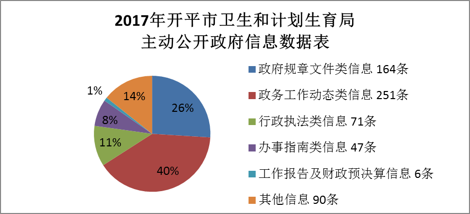 開平市衛(wèi)生和計(jì)劃生育局 2017年政府信息公開工作年度報(bào)告 根據(jù)《中華人民共和國(guó)政府信息公開條例》(以下簡(jiǎn)稱《條例》)和開平市人民政府要求,現(xiàn)編制開平市衛(wèi)生和計(jì)劃生育局2017年度政府信息公開工作報(bào)告。本報(bào)告中所列數(shù)據(jù)的統(tǒng)計(jì)期限自2017年1月1日至2017年12月31日止。本報(bào)告的電子版可在中共開平市委市政府公眾網(wǎng)站(www.mguide.com.cn)和“開平市衛(wèi)生和計(jì)劃生育局”信息公開門戶網(wǎng)站下載。如對(duì)本報(bào)告有任何疑問(wèn),請(qǐng)與開平市衛(wèi)生和計(jì)劃生育局辦公室聯(lián)系(地址:開平市人和東路12號(hào)5幢,郵編:529300,電話:2212725)。 一、概述 以市委十三屆二次全會(huì)“善作為 重實(shí)效 謀新篇”為工作主線,2017年開平市衛(wèi)生和計(jì)劃生育局積極做好深化醫(yī)藥衛(wèi)生體制改革提升醫(yī)療技術(shù)服務(wù),完善基本公共衛(wèi)生體系,鞏固人口計(jì)生服務(wù)水平和居民健康保障水平。嚴(yán)格按照黨的十八屆六中全會(huì)精神和《中華人民共和國(guó)政府信息公開條例》規(guī)定依法公開衛(wèi)生計(jì)生工作信息。組織全局領(lǐng)導(dǎo)干部深入學(xué)習(xí)《政府信息公開條例》、《保密法》、《保密法實(shí)施條例》,增強(qiáng)領(lǐng)導(dǎo)干部法制觀念和保密防范意識(shí),提高信息公開水平。通過(guò)各大媒體重點(diǎn)公開2017開平市衛(wèi)生計(jì)生工作有關(guān)信息,狠抓工作落實(shí),充分保障人民群眾的知情權(quán)、參與權(quán)、監(jiān)督權(quán)。 (一)加強(qiáng)組織領(lǐng)導(dǎo),落實(shí)信息公開要求。我局堅(jiān)持統(tǒng)一領(lǐng)導(dǎo),建立多方參與、密切配合、齊抓共管、合理運(yùn)行的有效機(jī)制。堅(jiān)持把信息公開工作擺上重要議事日程,信息公開工作領(lǐng)導(dǎo)小組認(rèn)真組織實(shí)施,把工作落到實(shí)處,同時(shí),各醫(yī)療衛(wèi)生計(jì)生單位、鎮(zhèn)衛(wèi)計(jì)局也參照局機(jī)關(guān)做法,分別成立相應(yīng)的工作小組,落實(shí)黨務(wù)、院務(wù)、計(jì)生信息公開,形成了橫向廣泛參與、縱向分級(jí)負(fù)責(zé)的信息網(wǎng)絡(luò)。 圖1:成立信息公開工作領(lǐng)導(dǎo)小組 (二)完善依申請(qǐng)公開機(jī)制。細(xì)化政府信息公開申請(qǐng)受理、辦理、答復(fù)各環(huán)節(jié)要求,優(yōu)化工作流程,妥善處理公開與保密的關(guān)系,依法做好依申請(qǐng)公開工作。強(qiáng)化信息公開考核,將衛(wèi)生計(jì)生“三欄”信息公開內(nèi)容、及時(shí)更新率納入計(jì)生考核內(nèi)容。針對(duì)工作中的熱點(diǎn)、難點(diǎn)問(wèn)題,做好溝通會(huì)商,不斷總結(jié)經(jīng)驗(yàn),提高辦理水平,切實(shí)維護(hù)申請(qǐng)人的合法權(quán)益。 二、主動(dòng)公開政府信息工作情況 2017年,我局嚴(yán)格按照《中華人民共和國(guó)政府信息公開條例》的規(guī)定,以公開為原則,以不公開為例外,通過(guò)政務(wù)網(wǎng)站、微信微博、報(bào)刊、公開宣傳欄、電子信息屏等多種形式公開信息,做好政策宣傳和解讀工作。 (一)依托開平市衛(wèi)生和計(jì)劃生育局政府門戶網(wǎng)站及開平市政府信息公開目錄系統(tǒng)主動(dòng)公開政府信息629條。其中,政府規(guī)章文件類信息164條,占26%;政務(wù)工作動(dòng)態(tài)類信息251條,占39.9%;行政執(zhí)法類信息71條,占11.3%;辦事指南類信息47條,占7.5%;工作報(bào)告及財(cái)政預(yù)決算信息6條,占1%;其他信息90條,占14.3%。 圖2:2017年開平市衛(wèi)生和計(jì)劃生育局主動(dòng)公開政府信息數(shù)據(jù)表 (二)做好“雙公開”工作,及時(shí)公開衛(wèi)生計(jì)生行政審批、行政執(zhí)法信息,公開開平市醫(yī)療衛(wèi)生機(jī)構(gòu)組織目錄表,依法公開2017年度部門預(yù)決算及2016年度財(cái)政撥款“三公”經(jīng)費(fèi)支出決算情況說(shuō)明。 (三)通過(guò)政務(wù)微博微信新媒體、工作簡(jiǎn)報(bào)向全市衛(wèi)生計(jì)生系統(tǒng)及全社會(huì)反映我市各項(xiàng)衛(wèi)生計(jì)生工作開展情況。2017年,通過(guò)“開平衛(wèi)生計(jì)生”政務(wù)微博發(fā)布信息1229條、通過(guò)“開平衛(wèi)生計(jì)生”政務(wù)微信訂閱號(hào)發(fā)布信息997條,編發(fā)《開平衛(wèi)生計(jì)生工作簡(jiǎn)報(bào)》共13期、《開平市基本公共衛(wèi)生服務(wù)項(xiàng)目工作簡(jiǎn)報(bào)》共18期。 (四)通過(guò)宣傳欄、電子信息屏等及時(shí)發(fā)布衛(wèi)生計(jì)生政策、服務(wù)收費(fèi)等工作信息。保障群眾對(duì)全市衛(wèi)生計(jì)生工作的知情權(quán)、參與權(quán)、監(jiān)督權(quán),努力為社會(huì)公眾提供更加簡(jiǎn)便、快捷、透明的服務(wù)。 1、在局機(jī)關(guān)多處宣傳欄發(fā)布行政審批流程、干部考察預(yù)告、公開干部選拔任用、獎(jiǎng)懲情況,接受群眾的監(jiān)督,張貼各類通知和便民信息,方便前來(lái)辦事的群眾。 2、強(qiáng)化鎮(zhèn)村衛(wèi)生計(jì)生“三欄”建設(shè)和政策宣傳解讀。廣泛宣傳計(jì)生新政、婚育新風(fēng)、疾病預(yù)防、保健常識(shí)和基本公共衛(wèi)生服務(wù)等信息。 3、加強(qiáng)院務(wù)公開工作。在各醫(yī)療