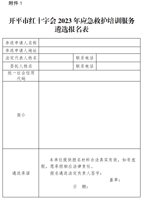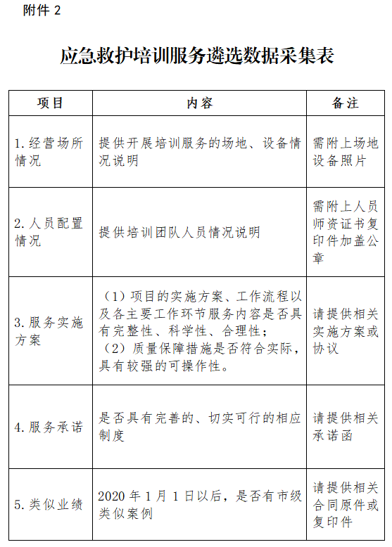 為促進我市應急救護培訓普及化、專業(yè)化和社會化,我會擬采購應急救護培訓服務,現(xiàn)面向社會征集遴選應急救護培訓服務提供機構(gòu)。 一、 項目基本情況及要求 (一)項目名稱內(nèi)容:應急救護培訓服務。 (二)預算金額:35000元(大寫:人民幣叁萬伍仟元整)。 (三)服務內(nèi)容: 1.應急救護知識普及; 2.初級救護員(持證)培訓; 3.CPR+AED救護員(持證)培訓。 (四)服務期限:自合同簽訂之日起至2023年12月31日。 二、服務機構(gòu)資格要求 參選申請人必須符合《中華人民共和國政府采購法》第二十二條規(guī)定并具備以下條件: (一)參選申請人必須是經(jīng)工商行政管理部門注冊登記、具有獨立法人資格或具有獨立承擔民事責任能力的其它組織; (二)具有完成培訓服務所必備的條件和能力,具備持有中國紅十字救護師資證書的團隊; (三)近三年內(nèi)無違法經(jīng)營行為,不得違背社會道德風尚,具有良好的社會信譽; (四)參選申請人注冊地及經(jīng)營場所必須在開平市市區(qū)(提供房產(chǎn)證明或經(jīng)營場所租賃合同復印件); (五)本服務不接受聯(lián)合體申報。 三、報名要求 (一)報名時間:2023年5月5日-2023年5月11日。 (二)報名地點:開平市紅十字會辦公室(地址:開平市長沙東興大道人和東路12號5幢,聯(lián)系人:鄒小姐,電話:2213653)。 四、資料提交 (一)開平市紅十字會2023年應急救護培訓服務遴選報名表(附件1); (二)經(jīng)辦人員身份證復印件、授權(quán)委托書; (三)有效營業(yè)執(zhí)照副本或社會團體法人登記證書復印件加蓋公章(業(yè)務范圍包括急救知識宣講或應急救護等服務內(nèi)容); (四)經(jīng)營場所證明材料(提供房產(chǎn)證明或經(jīng)營場所租賃合同復印件加蓋公章); (五)參選申請人按照《應急救護培訓服務遴選數(shù)據(jù)采集表》(附件2)提供相關(guān)證明材料; (六)參與本項目投標前三年內(nèi),在經(jīng)營活動中沒有重大違法記錄承諾書。 上述資料請?zhí)峁┮皇轿宸荩蠹由w單位公章,統(tǒng)一裝訂密封封裝提交。 附件:1.開平市紅十字會2023年應急救護培訓服務遴選報名表 2.應急救護培訓服務遴選數(shù)據(jù)采集表 廣東省開平市紅十字會 2023年5月4日 【下載】 關(guān)于征集遴選開平市紅十字會2023年應急救護培訓服務提供機構(gòu)的公告.docx 附件1:開平市紅十字會2023年應急救護培訓服務遴選報名表.docx 附件2:應急救護培訓服務遴選數(shù)據(jù)采集表.docx