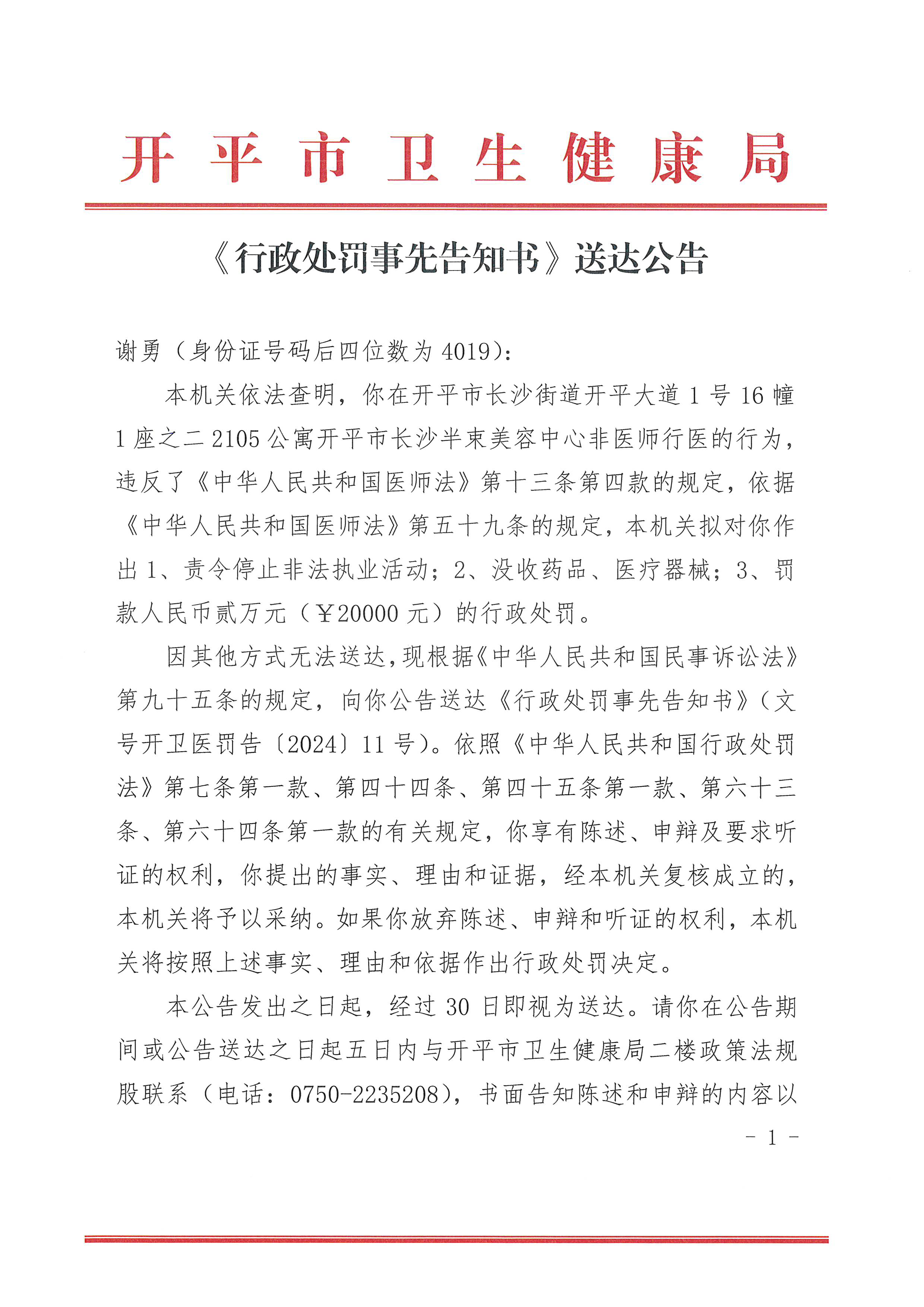 謝勇(身份證號(hào)碼后四位數(shù)為4019): 本機(jī)關(guān)依法查明,你在開平市長(zhǎng)沙街道開平大道1號(hào)16幢1座之二2105公寓開平市長(zhǎng)沙半束美容中心非醫(yī)師行醫(yī)的行為,違反了《中華人民共和國(guó)醫(yī)師法》第十三條第四款的規(guī)定,依據(jù)《中華人民共和國(guó)醫(yī)師法》第五十九條的規(guī)定,本機(jī)關(guān)擬對(duì)你作出1、責(zé)令停止非法執(zhí)業(yè)活動(dòng);2、沒收藥品、醫(yī)療器械;3、罰款人民幣貳萬元(¥20000元)的行政處罰。 因其他方式無法送達(dá),現(xiàn)根據(jù)《中華人民共和國(guó)民事訴訟法》第九十五條的規(guī)定,向你公告送達(dá)《行政處罰事先告知書》(文號(hào)開衛(wèi)醫(yī)罰告〔2024〕11號(hào))。依照《中華人民共和國(guó)行政處罰法》第七條第一款、第四十四條、第四十五條第一款、第六十三條、第六十四條第一款的有關(guān)規(guī)定,你享有陳述、申辯及要求聽證的權(quán)利,你提出的事實(shí)、理由和證據(jù),經(jīng)本機(jī)關(guān)復(fù)核成立的,本機(jī)關(guān)將予以采納。如果你放棄陳述、申辯和聽證的權(quán)利,本機(jī)關(guān)將按照上述事實(shí)、理由和依據(jù)作出行政處罰決定。 本公告發(fā)出之日起,經(jīng)過30日即視為送達(dá)。請(qǐng)你在公告期間或公告送達(dá)之日起五日內(nèi)與開平市衛(wèi)生健康局二樓政策法規(guī)股聯(lián)系(電話:0750-2235208),書面告知陳述和申辯的內(nèi)容以及是否要求聽證,逾期則視為放棄上述權(quán)利。 特此公告 開平市衛(wèi)生健康局 2024年6月13日
