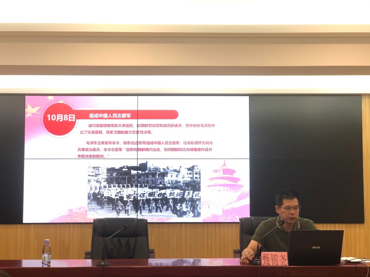 為紀(jì)念中國人民志愿軍抗美援朝出國作戰(zhàn)70周年,繼承和弘揚(yáng)偉大抗美援朝精神,11月10日,市應(yīng)急管理局黨支部開展“紀(jì)念抗美援朝出國作戰(zhàn)70周年”專題黨課。黨支部書記、副局長甄錦堯帶領(lǐng)局機(jī)關(guān)全體黨員干部、西部森林消防大隊(duì)全體隊(duì)員重溫抗美援朝歷史,領(lǐng)悟偉大抗美援朝精神。 黨課從抗美援朝大事件、抗美援朝的重大意義、抗美援朝的豐富內(nèi)涵三方面,再一次追憶歷史、學(xué)習(xí)歷史、緬懷歷史,使與會全體同志深刻認(rèn)識到繼承和弘揚(yáng)偉大抗美援朝精神的重大意義。 甄錦堯指出,偉大的抗美援朝精神,是中國共產(chǎn)黨人和人民軍隊(duì)崇高風(fēng)范的生動(dòng)寫照,是中華民族傳統(tǒng)美德和民族品格的集中展示,是以愛國主義為核心的民族精神的具體體現(xiàn),永遠(yuǎn)是中國人民和中華民族的寶貴財(cái)富??姑涝瘧?zhàn)爭,不僅奏響了一曲可歌可泣的凱歌,更鍛造出偉大的抗美援朝精神。紀(jì)念抗美援朝,緬懷革命先烈的豐功偉績,是為了學(xué)習(xí)共產(chǎn)黨人敢于斗爭、不怕犧牲、艱苦奮斗、不斷前進(jìn)的精神風(fēng)范,也激勵(lì)我們堅(jiān)定共產(chǎn)主義理想和為人民服務(wù)的信念,發(fā)揮愛崗敬業(yè)精神,用心用情用力做好人民群眾的守夜人。 通過本次專題黨課學(xué)習(xí),局機(jī)關(guān)全體同志紛紛表示,偉大的抗美援朝精神,不論過去、現(xiàn)在還是將來,都永遠(yuǎn)是我們戰(zhàn)勝一切艱難險(xiǎn)阻、克敵制勝的精神支柱。我們要向70年前雄赳赳、氣昂昂、跨過鴨綠江的革命前輩致敬,我們更要在以后的工作中,積極發(fā)揚(yáng)偉大抗美援朝精神,用實(shí)際行動(dòng)踐行使命職責(zé)與時(shí)代擔(dān)當(dāng),為我市應(yīng)急管理事業(yè)作出更大的貢獻(xiàn)。