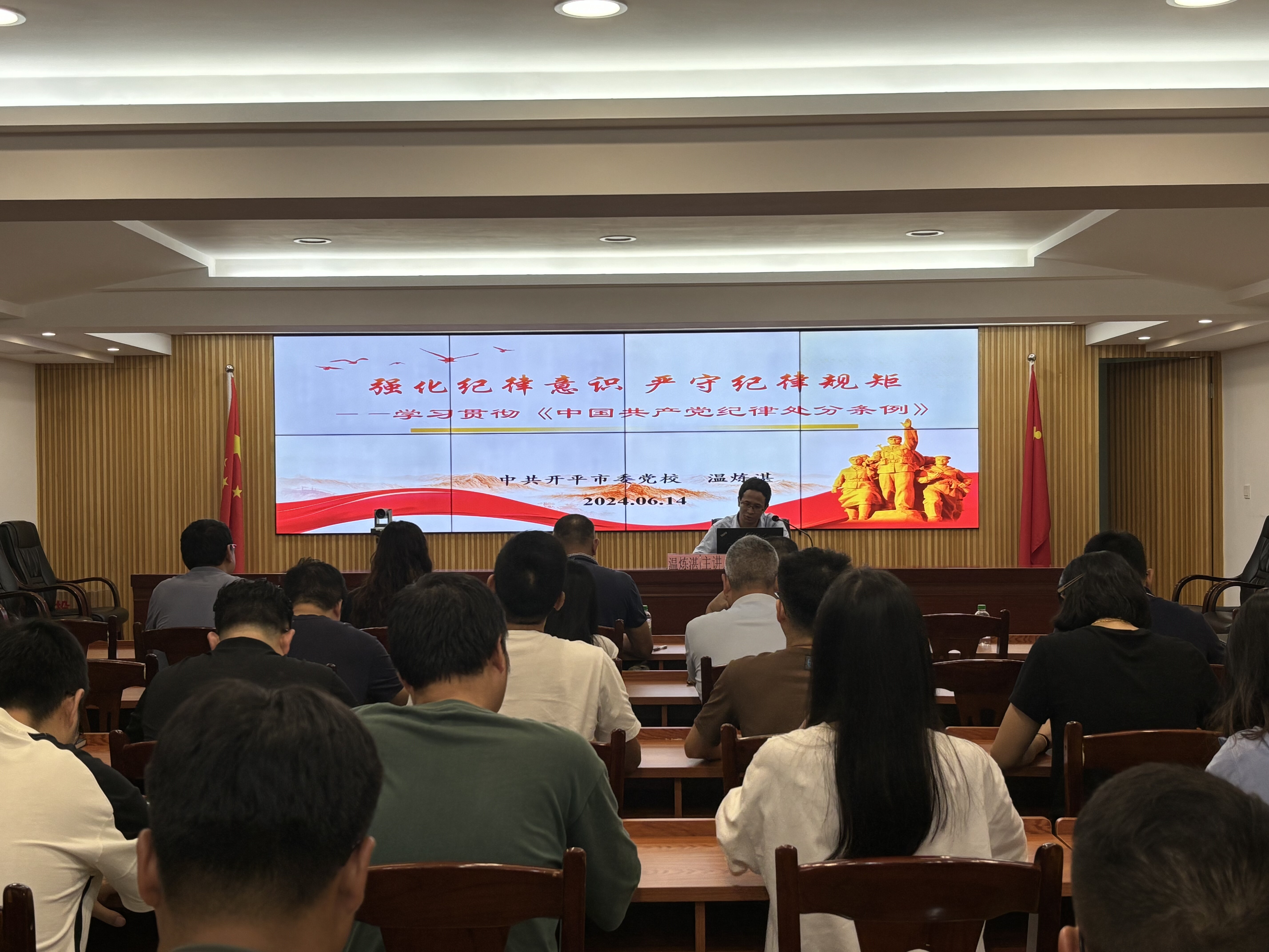 6月14日,市應急管理局召開黨紀學習教育宣講活動,邀請市委黨校溫煉湛老師作黨紀學習教育主題宣講,局全體黨員干部、職工、大隊隊員共50人參加此次活動。