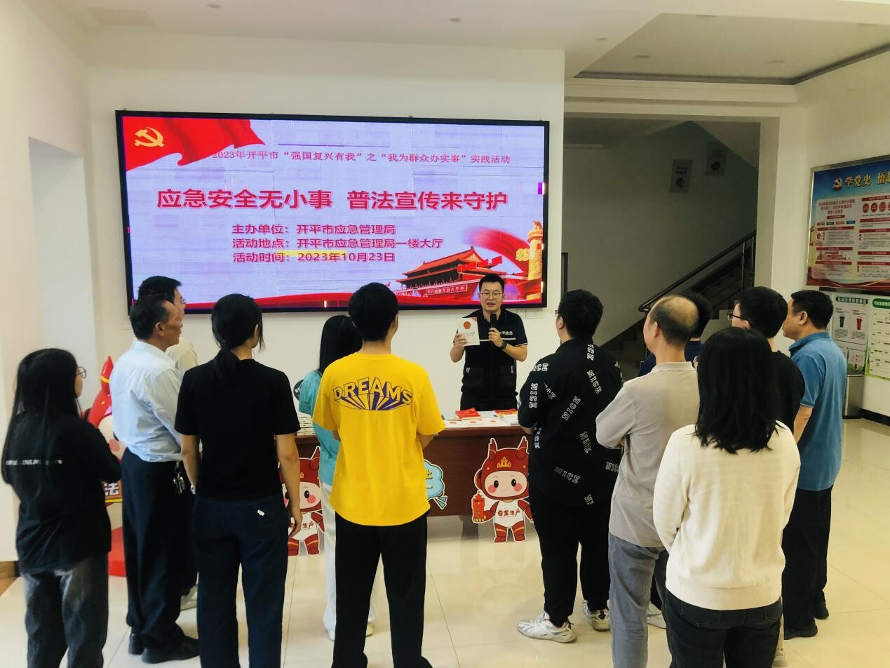 為進(jìn)一步提高全民普法意識(shí),推進(jìn)應(yīng)急普法工作走深走實(shí),10月23日下午,開(kāi)平市應(yīng)急管理局在局一樓大堂開(kāi)展“應(yīng)急安全無(wú)小事、普法宣傳來(lái)守護(hù)”為主題的“強(qiáng)國(guó)復(fù)興有我”之“我為群眾辦實(shí)事”實(shí)踐活動(dòng)。 市應(yīng)急管理局開(kāi)展“強(qiáng)國(guó)復(fù)興有我”之“我為群眾辦實(shí)事”實(shí)踐活動(dòng) 活動(dòng)邀請(qǐng)了三埠街道長(zhǎng)沙東社區(qū)干部、居民和轄區(qū)的企業(yè)代表近20人參加了應(yīng)急普法活動(dòng)?;顒?dòng)上緊扣“誰(shuí)執(zhí)法誰(shuí)普法”和應(yīng)急管理工作的實(shí)際,為群眾全方位宣傳安全生產(chǎn)法、突發(fā)事件應(yīng)對(duì)、防災(zāi)減災(zāi)救災(zāi)和森林防滅火等法律法規(guī)宣傳,并通過(guò)解讀法律條例、解析警示案例、派發(fā)宣傳單張和小禮品的形式,提升全民安全意識(shí)和法治素養(yǎng),努力提高應(yīng)急法治宣傳的傳播力、引導(dǎo)力、影響力,營(yíng)造良好的安全氛圍。 市應(yīng)急管理局每年組織鎮(zhèn)(街)、村(社區(qū))和企業(yè)開(kāi)展應(yīng)急普法進(jìn)企業(yè)、進(jìn)農(nóng)村、進(jìn)社區(qū)、進(jìn)學(xué)校、進(jìn)家庭活動(dòng)。三年來(lái),已開(kāi)展了389場(chǎng)應(yīng)急普法宣講活動(dòng),讓安全意識(shí)深入人心,努力為群眾辦實(shí)事,帶動(dòng)全市干部群眾共繪法治同心圓,以高水平安全護(hù)航高質(zhì)量發(fā)展。 工作人員為企業(yè)代表、社區(qū)群眾開(kāi)展應(yīng)急普法