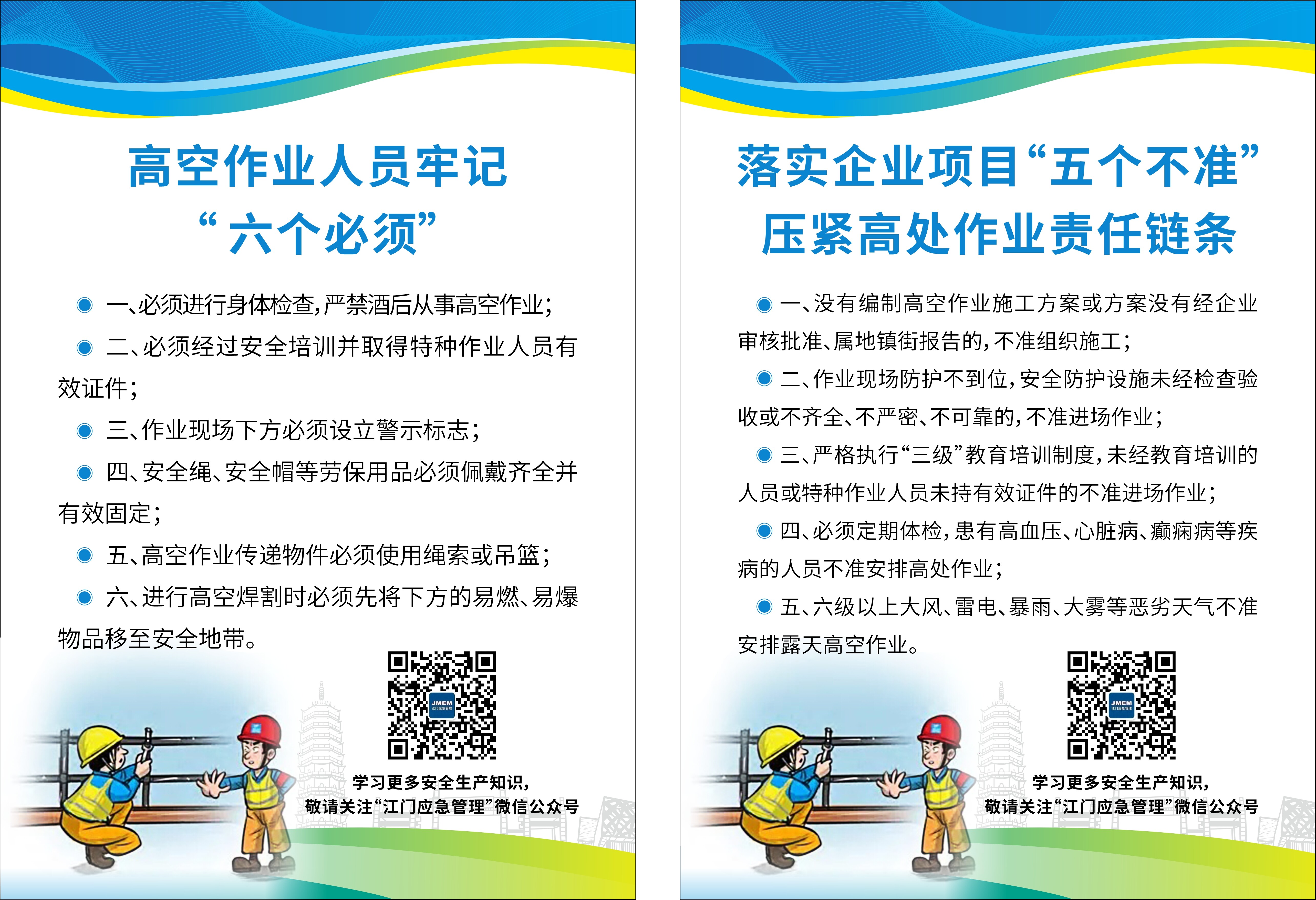 高處作業(yè) 高處作業(yè)指凡在墜落高度基準面2m以上(含2m)有可能墜落的高處進行的作業(yè)。 高處墜落 高處墜落指在高處作業(yè)中發(fā)生墜落造成的傷亡事故。事故發(fā)生往往是因為,高處作業(yè)的安全設(shè)施不齊全,作業(yè)人員安全意識不強,以及企業(yè)未按照規(guī)范要求施工,安全管理不到位。 施工現(xiàn)場涉及高處作業(yè)較多,并且,交叉作業(yè)多,作業(yè)人員安全素質(zhì)參差不齊,若防高墜措施落實不到位,極易發(fā)生高處墜落事件,同時,高墜經(jīng)常還會伴隨著對人員的物體打擊,將給作業(yè)人員生命財產(chǎn)帶來較大危害,為有效管控作業(yè)安全風險,對施工現(xiàn)場高墜主要原因進行分析,落實有效管控措施,始終保持作業(yè)現(xiàn)場安全可控、在控、能控。 一、高處墜落事故原因分析 1、人的不安全行為 (1)高處作業(yè)時未規(guī)范使用個人安全防護用品。如安全帽、安全帶、防滑鞋等。 (2)未按規(guī)定的通道進入現(xiàn)場,隨意攀爬腳手架、陽臺、門窗等。 (3)作業(yè)人員未經(jīng)現(xiàn)場安全人員同意擅自拆除安全防護設(shè)施。 2、物的不安全狀態(tài) (1)洞口、臨邊、作業(yè)平臺等未設(shè)置安全防護設(shè)施或設(shè)置不合格。 (2)安全防護設(shè)施不符合規(guī)定,不滿足防護要求。 3、管理不到位 (1)安全組織網(wǎng)絡(luò)不健全、安全責任制未落實、安全規(guī)章制度執(zhí)行不嚴格。 (2)施工作業(yè)組織不合理,未有效避免交叉作業(yè)等。 (3)違規(guī)安排不符合高處作業(yè)資格人員從事高處作業(yè)。 (4)作業(yè)前安全交底不到位,未對作業(yè)人員開展安全教育培訓(xùn)。 4、環(huán)境因素 (1)作業(yè)場所濕滑、雜亂等。 (2)存在惡劣氣候,如五級及以上大風、暴雨、大雪、大霧等惡劣天氣。 二、高處墜落事故防范措施 1、正確規(guī)范使用個人安全防護器具 (1)凡在2米及以上的懸空作業(yè),應(yīng)佩戴安全帶,作業(yè)過程中應(yīng)隨時檢查安全帶是否拴牢。高處作業(yè)人員在轉(zhuǎn)移作業(yè)位置時不得失去安全保護。 (2)安全帶應(yīng)高掛低用,并應(yīng)扣牢在牢固的物體上。 (3)缺少或不易設(shè)置安全帶吊點的工作場所應(yīng)設(shè)置安全繩索。 2、操作平臺應(yīng)搭設(shè)規(guī)范,符合安全要求 操作平臺有固定操作平臺(腳手架等)和移動式操作平臺。 (1)腳手架搭設(shè)應(yīng)編制專項施工方案,應(yīng)符合腳手架搭設(shè)安全技術(shù)規(guī)范,經(jīng)監(jiān)理項目部驗收合格后方可使用。 (2)操作平臺四周應(yīng)設(shè)置防護欄桿,腳手板應(yīng)鋪滿、鋪穩(wěn)、鋪實、鋪平并綁牢或扣緊,嚴禁出現(xiàn)大于150mm探頭板。 (3)腳手架搭設(shè)人員應(yīng)持證上崗并正確佩戴和使用安全防護用品。 (4)移動式操作平臺,輪子應(yīng)有自鎖功能,并保證自鎖力矩;移動式操作平臺移動時,平臺上不得站人。 3、臨邊與墜落面的高差大于2米時,應(yīng)設(shè)置臨邊防護 (1)臨邊作業(yè)場所應(yīng)設(shè)置防護欄桿。防護欄桿應(yīng)裝設(shè)不低于1.2m高的護欄(0.5m~0.6m處設(shè)腰桿),并設(shè)180mm高的擋腳板,立桿間距不應(yīng)大于2m,底端應(yīng)固定牢固。 (2)當屋面女兒墻高度小于0.8米時,墜落面的高差大于2米時,也應(yīng)設(shè)置臨邊防護。 (3)防護欄桿應(yīng)張掛密目式安全立網(wǎng)或用其他材料封閉,采用密目式安全立網(wǎng)時,網(wǎng)間連接應(yīng)牢固、嚴密。 (4)當在高處作業(yè)的屋面坡度大于25o時,防護欄桿高度應(yīng)不低于1.5m。 4、作業(yè)場所洞口應(yīng)采取防墜落措施 作業(yè)場所的洞口分為大洞口和小洞口。大洞口一般為短邊尺寸大于1.5米的洞口,小洞口一般為短邊尺寸小于1.5米的洞口。 (1)對于小洞口可采取硬質(zhì)蓋板進行覆蓋,蓋板應(yīng)滿足一定的強度,滿足承載力要求,并且,蓋板上應(yīng)刷警示漆以標示。 (2)對于大洞口可采取設(shè)置防護欄桿的方式進行隔離,防護欄桿距離洞口邊不得小于20cm,洞口應(yīng)用安全平網(wǎng)封閉。 (3)對于窗臺口的高度低于0.8米的,可采用加設(shè)橫桿進行防護,防護欄桿距地的高度應(yīng)在1.2米。 5、電梯井口處應(yīng)采取防墜落措施 (1)電梯井口應(yīng)設(shè)置防護柵門,并刷以警示標志,其高度不應(yīng)小于1.8m,防護門底端距地面高度不應(yīng)大于50mm,并應(yīng)設(shè)置180mm的擋腳板;防護門應(yīng)設(shè)置醒目的“當心墜落”“注意安全”安全警示標識。 (2)在電梯施工前,電梯豎井內(nèi)應(yīng)每隔兩層且不大于10m設(shè)置一道安全平網(wǎng)。 預(yù)防高處墜落事故 高空作業(yè)“六個必須”“五個不準” 請務(wù)必做到