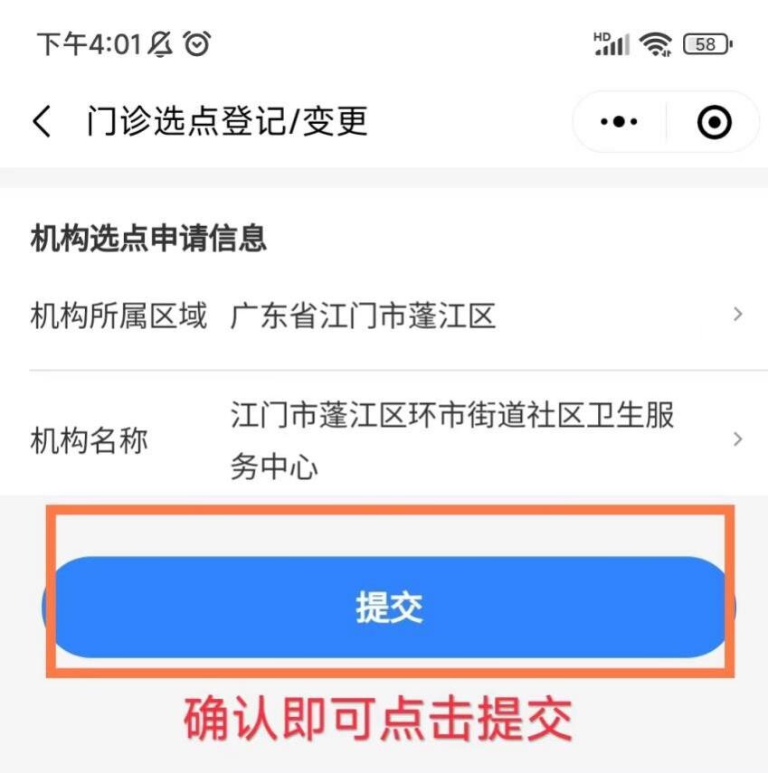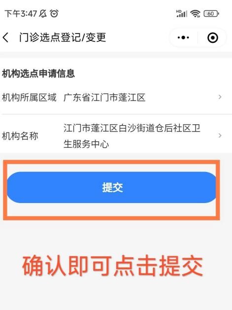 第三步:選擇需要門診選點(diǎn)登記的定點(diǎn)醫(yī)療機(jī)構(gòu),完成后點(diǎn)擊提交,系統(tǒng)顯示“提交成功”,選點(diǎn)結(jié)果信息可在前端頁(yè)面展示。