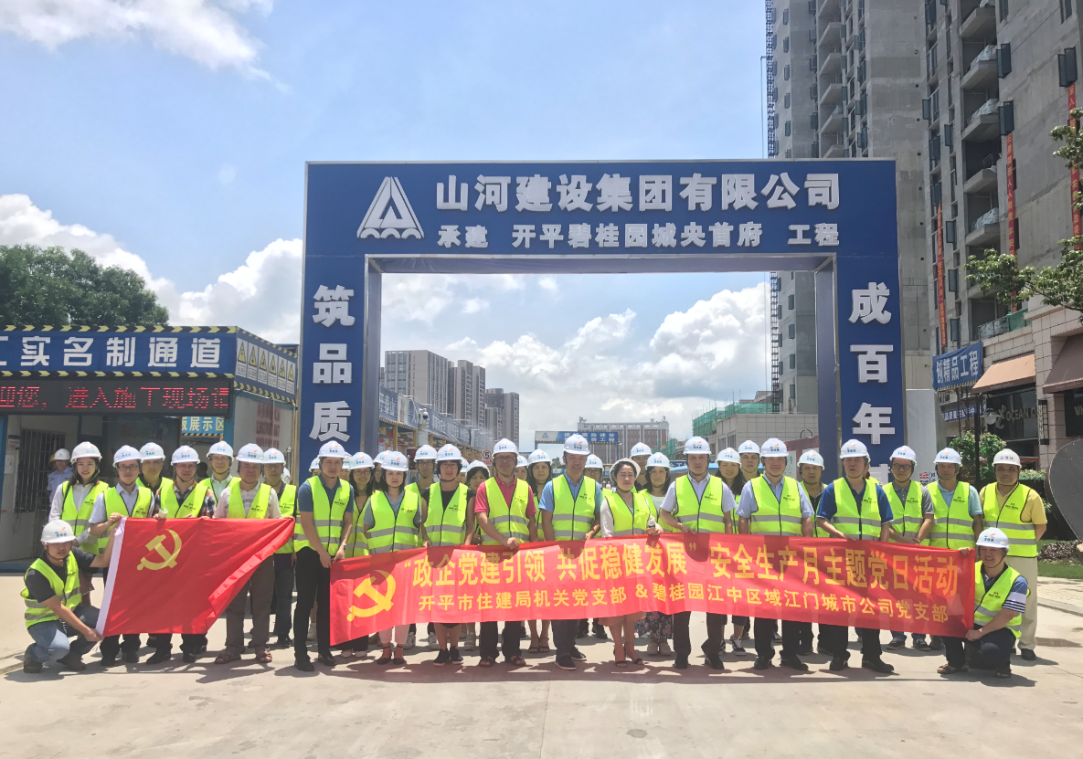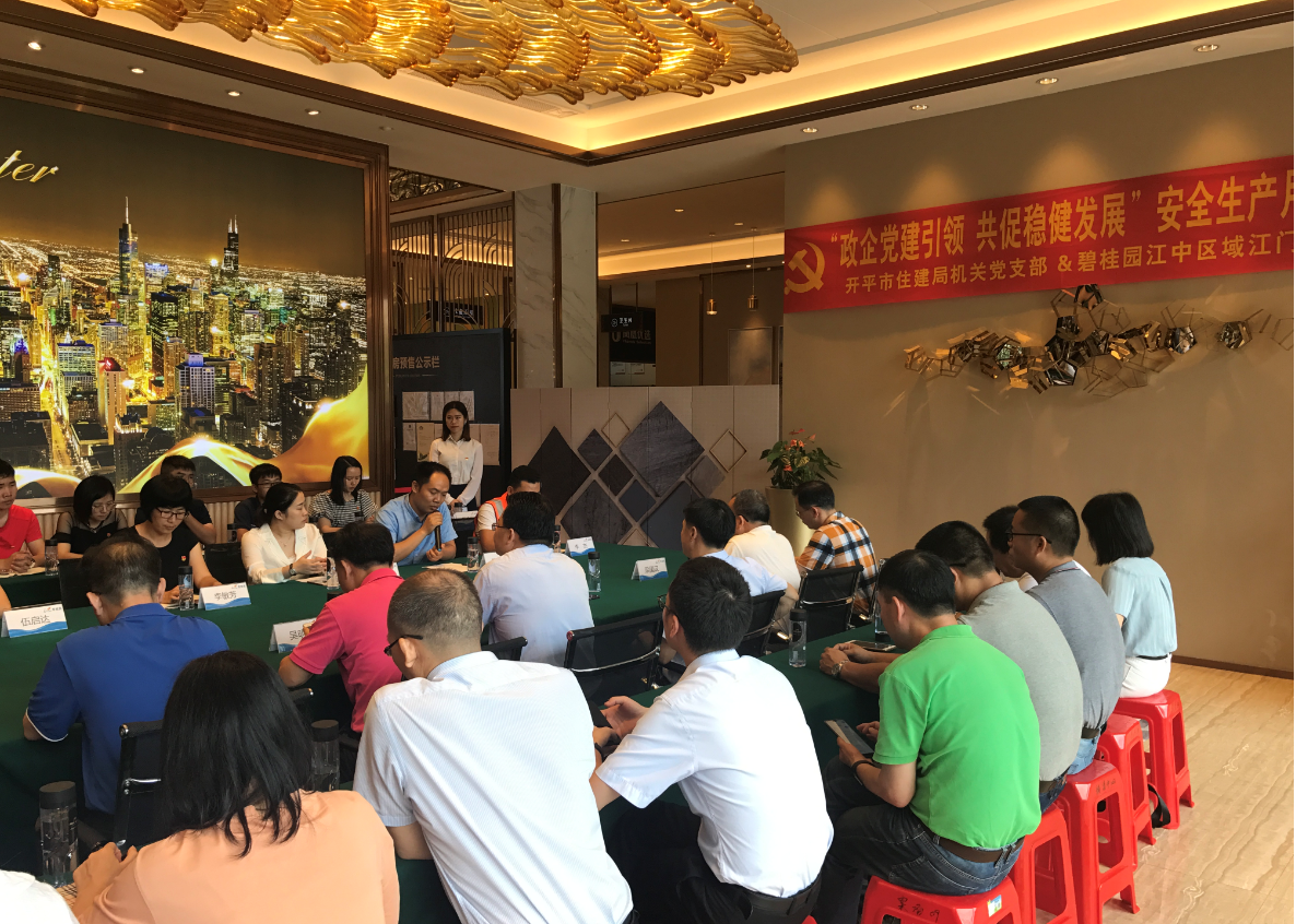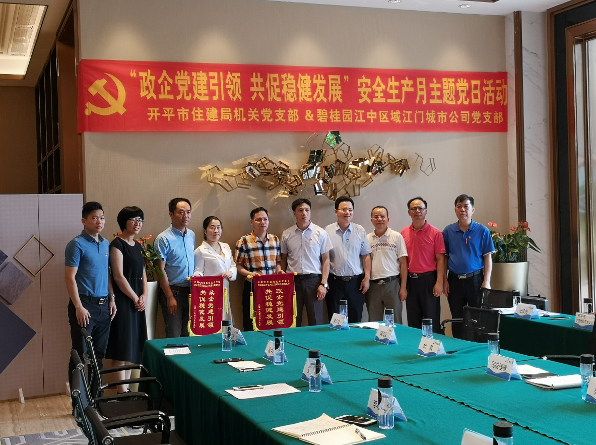 為積極推進(jìn)政企黨務(wù)建設(shè)和安全生產(chǎn)月的工作要求,6月21日,開平市住建局機(jī)關(guān)黨支部與碧桂園江中區(qū)域江門城市公司黨支部在開平碧桂園·城央首府聯(lián)合開展了“政企黨建引領(lǐng),共促穩(wěn)健發(fā)展”安全生產(chǎn)月主題黨日活動(dòng)。開平市住建局黨組書記、局長(zhǎng)胡震、副局長(zhǎng)司徒國(guó)健、副局長(zhǎng)梁國(guó)漢、總工程師吳明欽、主任科員張春發(fā)以及黨支部書記曾漢斌等一行36人出席活動(dòng)。碧桂園江中區(qū)域江門城市公司黨支部書記艾澍嶠、江門城市公司開平片區(qū)總經(jīng)理翟中勇和江門城市公司黨支部副書記李敏芳帶領(lǐng)江門城市公司黨支部黨員共同參與。