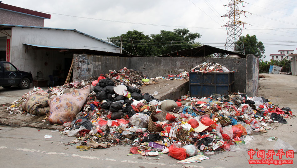 逕頭垃圾中轉站原來的作用只是收集逕頭城區(qū)部分的垃圾。按照開平市農村垃圾處理方案要求,各村(居)委會應在各村設置垃圾容器,鎮(zhèn)(街道)自行把收集到的垃圾運送到市垃圾場去處理。開平市環(huán)衛(wèi)處副主任方錦安:“但是,在逕頭居委會的農村垃圾就這樣倒來這里。他們又不是倒進斗里,而是倒落地面,我們已經提醒他們很多次了,他們每次都沒有整改。一般10日左右就運一次垃圾出來這里,用簡易車、手扶機全倒到地面,很不合作。”