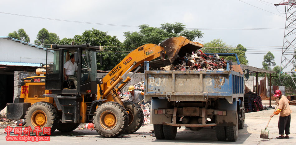 5月20日上午,開平市逕頭垃圾中轉站地面垃圾堆積如山,環(huán)衛(wèi)工人用鏟車清理堆在地面的大量垃圾達5車。環(huán)衛(wèi)部門表示,本來這里每天僅收集1車垃圾,但3年來,這里每隔10日左右就有一大堆垃圾倒?jié)M地,是逕頭居委會各村把收集的垃圾都倒到這里來形成的。
