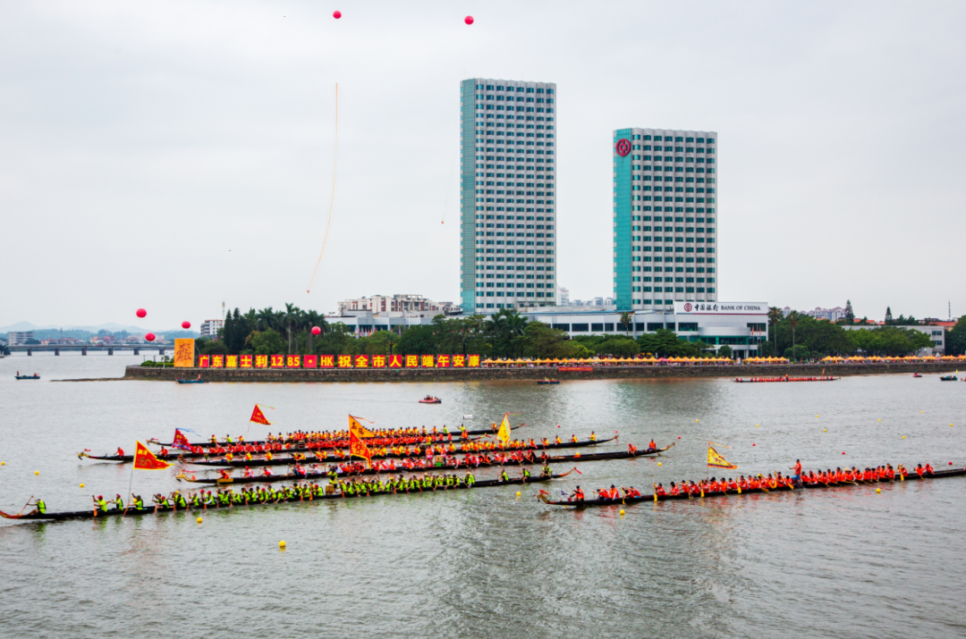 仲夏時(shí)節(jié)的潭江河畔,鼓聲震天,浪花激揚(yáng)。隨著水面冷煙花的璀璨綻放和開賽令下,一艘艘蓄勢待發(fā)的龍舟如離弦之箭般沖破水面。水面之上,鼓點(diǎn)強(qiáng)勁如雷鳴,舵手精準(zhǔn)指揮,隊(duì)員們弓身發(fā)力,整齊的船槳?jiǎng)澠票滩?,水花飛濺間展現(xiàn)著力與美的完美融合。