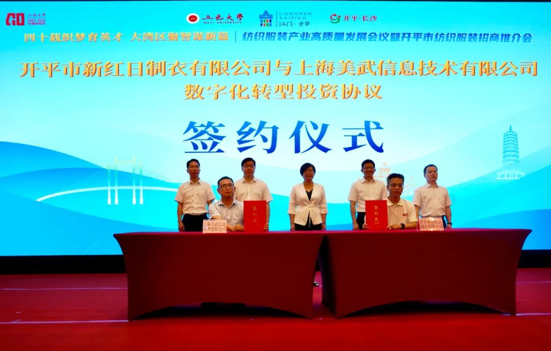 在現(xiàn)場(chǎng)舉行的簽約儀式上,五邑大學(xué)紡織科學(xué)與工程學(xué)院與開(kāi)平市紡織服裝行業(yè)協(xié)會(huì)簽訂人才培養(yǎng)戰(zhàn)略合作協(xié)議;長(zhǎng)沙街道辦事處與江門(mén)市津泓新材料科技有限公司簽訂投資意向協(xié)議;開(kāi)平市新紅日制衣有限公司與上海美武信息技術(shù)有限公司簽訂數(shù)字化轉(zhuǎn)型投資協(xié)議,為開(kāi)平紡織產(chǎn)業(yè)人才儲(chǔ)備、技術(shù)升級(jí)及全鏈條高質(zhì)量發(fā)展注入強(qiáng)勁動(dòng)能。