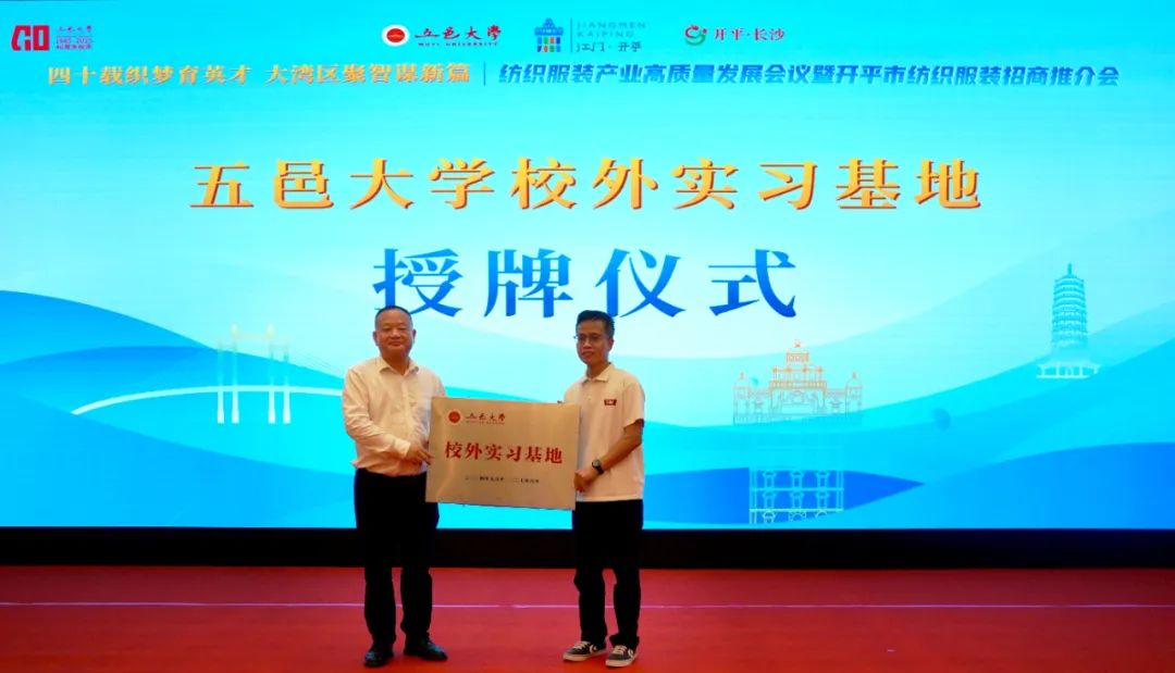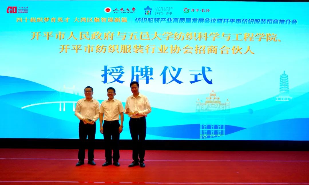 同時(shí),開(kāi)平市向五邑大學(xué)紡織科學(xué)與工程學(xué)院、開(kāi)平市紡織服裝行業(yè)協(xié)會(huì)授予“招商合伙人”牌匾,精準(zhǔn)賦能開(kāi)平紡織產(chǎn)業(yè)鏈招商;五邑大學(xué)向開(kāi)平市紅日制衣有限公司授予“五邑大學(xué)校外實(shí)習(xí)基地”牌匾,進(jìn)一步促進(jìn)人才培養(yǎng)與實(shí)踐教學(xué)的雙向融合。