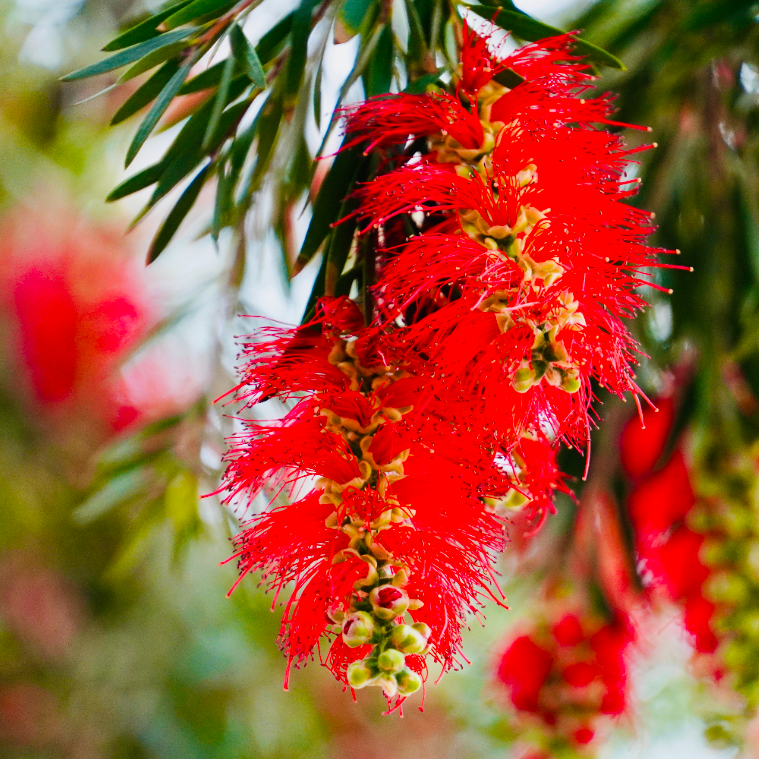 其實(shí)此“柳”非彼“柳”,這種開滿鮮紅花朵的植物名為“垂枝紅千層”,又名“串錢柳”,原產(chǎn)自澳大利亞,引入我國不過百來年,是一種常綠灌木或小喬木,花葉都極具觀賞性。幼枝和幼葉上都有一層薄薄的白色絨毛,遠(yuǎn)遠(yuǎn)望去就像籠罩著一層霧氣,頗有一種特殊的神秘氣息。垂枝紅千層是城市中常見的行道樹、風(fēng)景樹,多用于沿路、沿江河生態(tài)景觀建設(shè),且垂枝紅千層在滿足園林審美的同時(shí),還能起到凈化空氣、減少塵埃、吸收噪音的效果,堪稱“花界勞模”。 垂枝紅千層花期長 較集中于春末夏初 性喜溫暖濕潤氣候 在開平近日連綿陰雨天氣的滋潤下 垂枝紅千層開得 比往年更為艷麗 在朦朦霧氣中 與街景、車流一同營造出了 一片影影綽綽、流光幻影般的 “王家衛(wèi)”式電影效果 為“綠美開平”增添了一筆 濃墨重彩的春日“繁花”景象