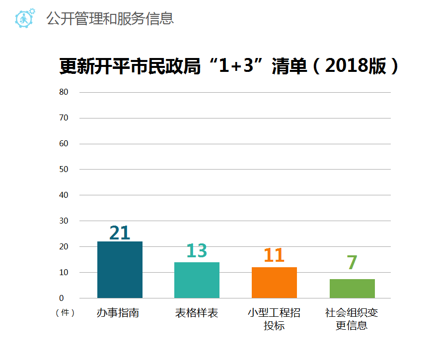 2.及時更新公開管理和服務信息。更新開平市民政局“1+3”清單(2018版),更新公開辦事指南21條、表格樣表13類。及時準確公開小型工程招投標11條。每季度及時公開我市新成立社會組織信息,實時公開社會組織變更信息7條。