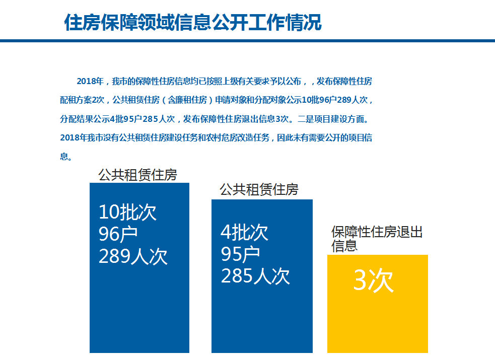 分配結果公示4批95戶285人次,發(fā)布保障性住房退出信息3次。二是項目建設方面。2018年我市沒有公共租賃住房建設任務和農村危房改造任務,因此未有需要公開的項目信息。