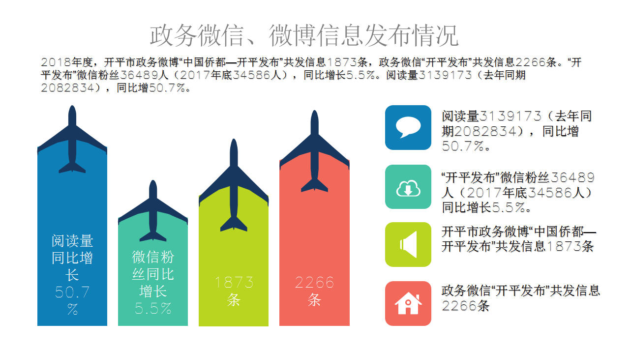 2018年度,開平市政務微博“中國僑都—開平發(fā)布”共發(fā)信息1873條,政務微信“開平發(fā)布”共發(fā)信息2266條?!伴_平發(fā)布”微信粉絲36489人(2017年底34586人),同比增長5.5%。閱讀量3139173(去年同期2082834),同比增50.7%。
