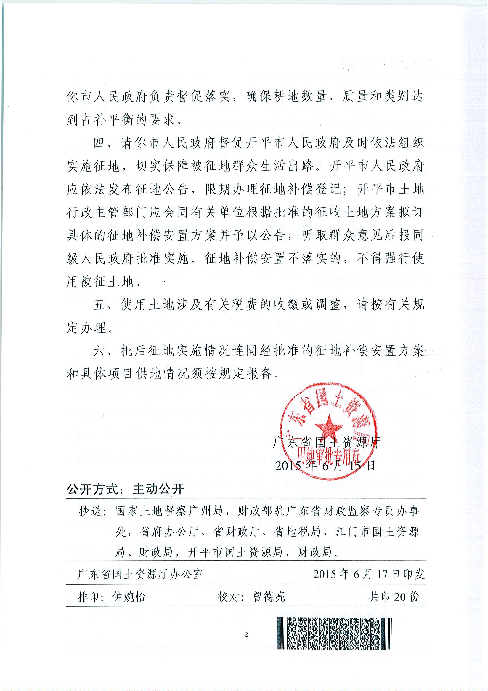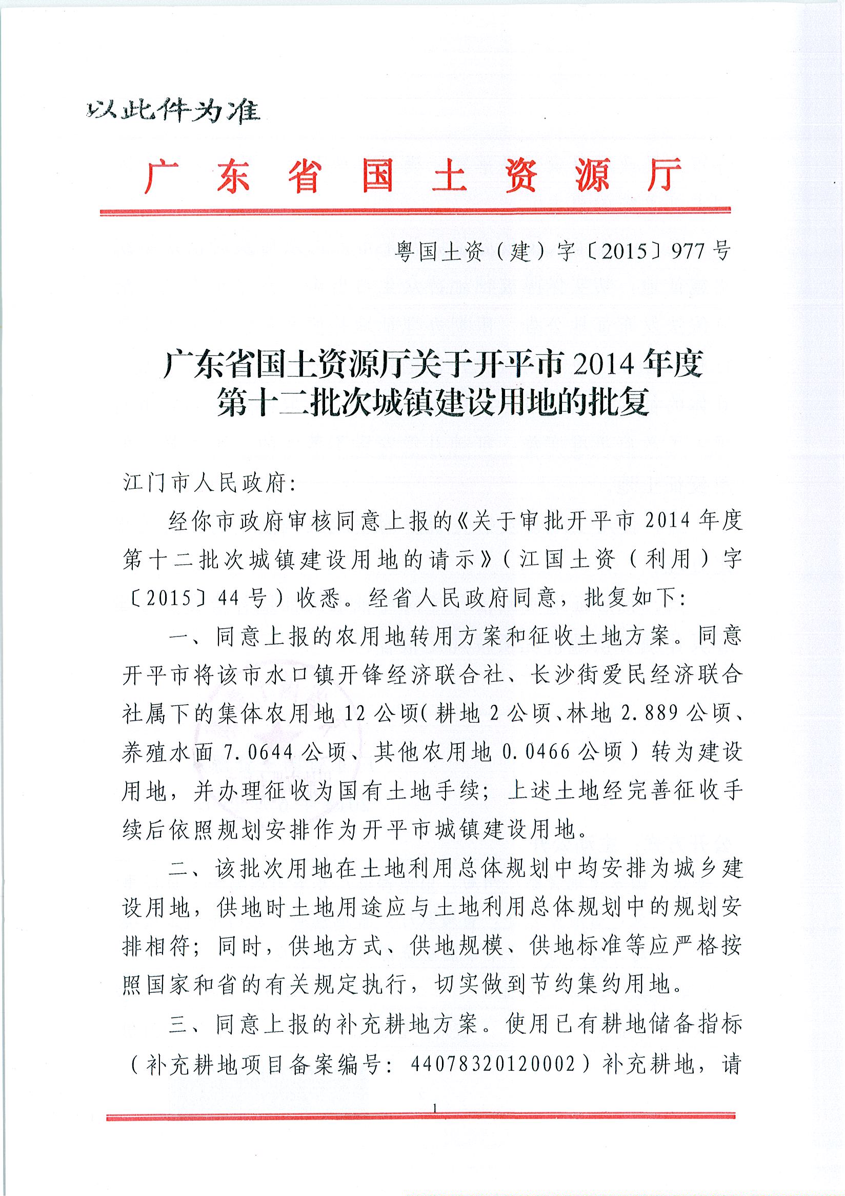 開平市2014年度第十二批次城鎮(zhèn)建設(shè)用地的批復(fù)