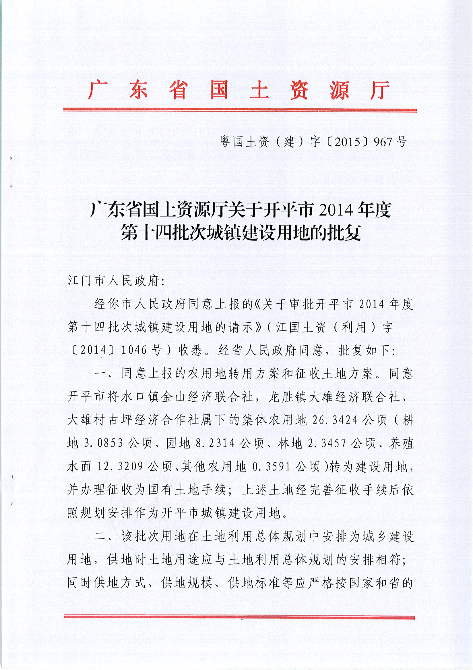 開平市2014年度第十四批次城鎮(zhèn)建設(shè)用地的批復(fù)