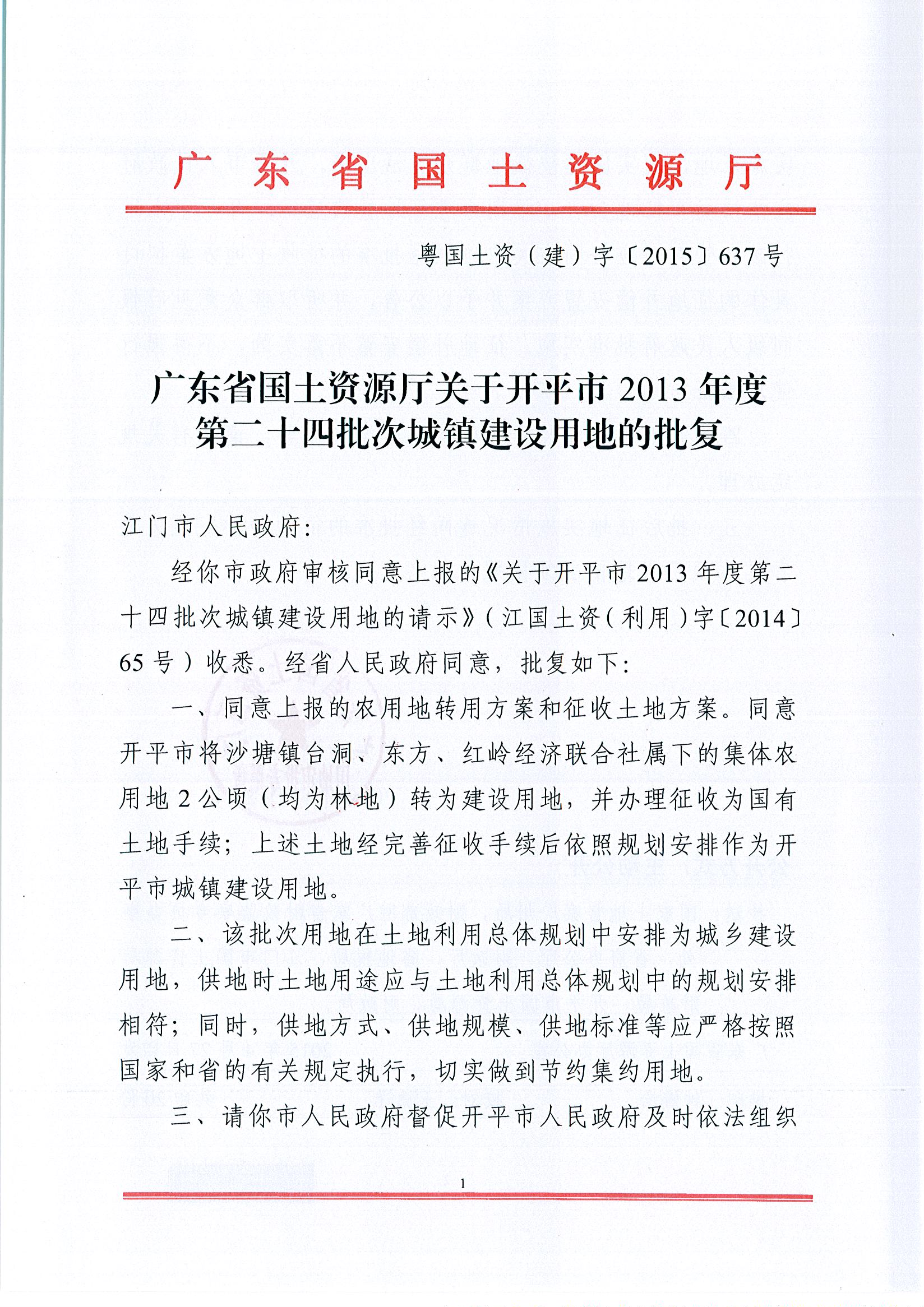 開平市2013年度第二十四批次城鎮(zhèn)建設(shè)用地的批復(fù)