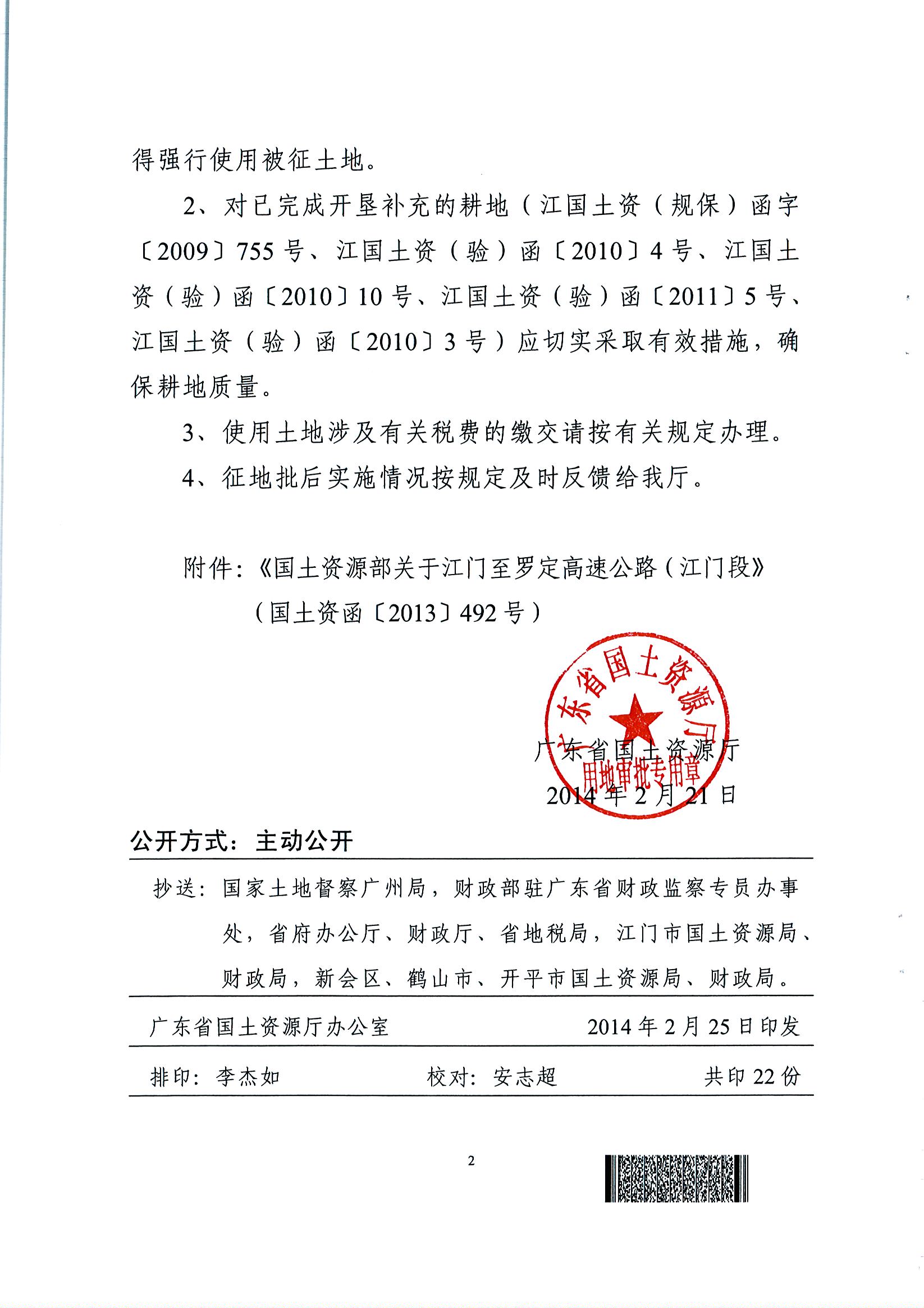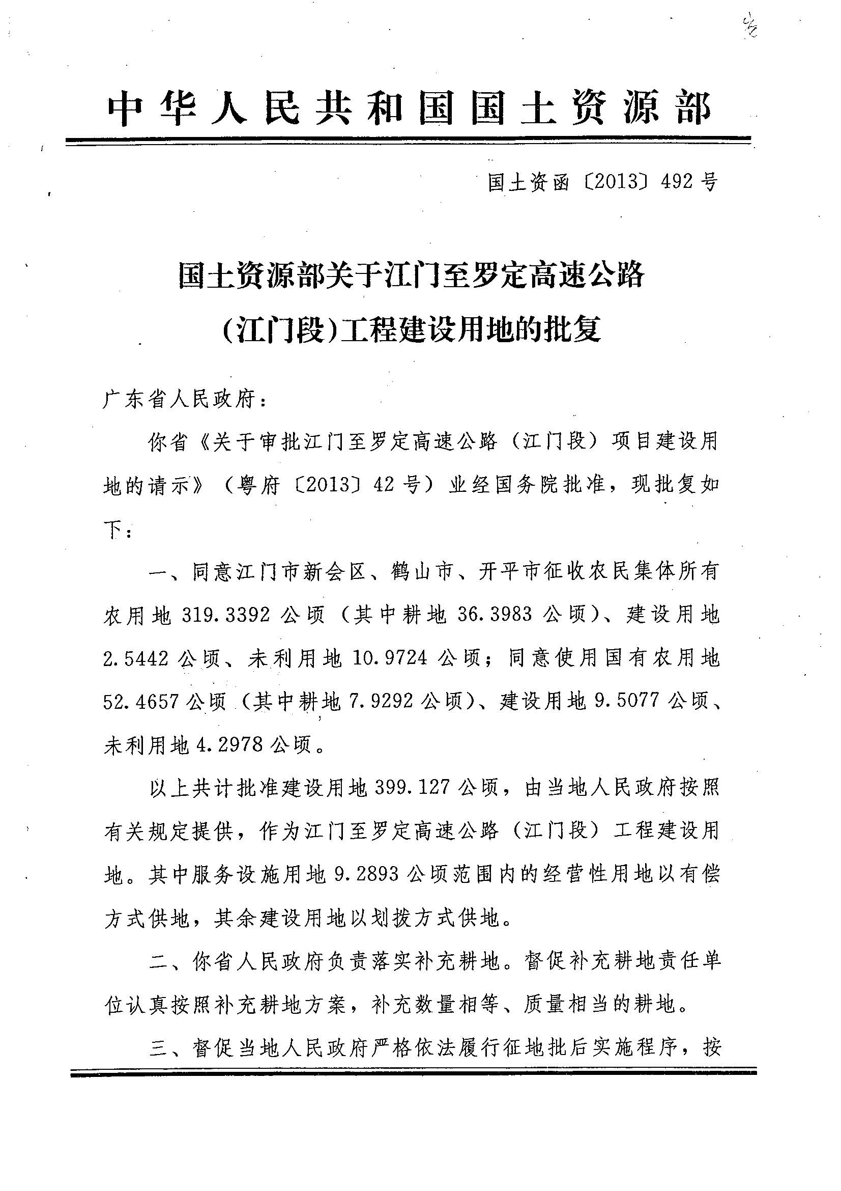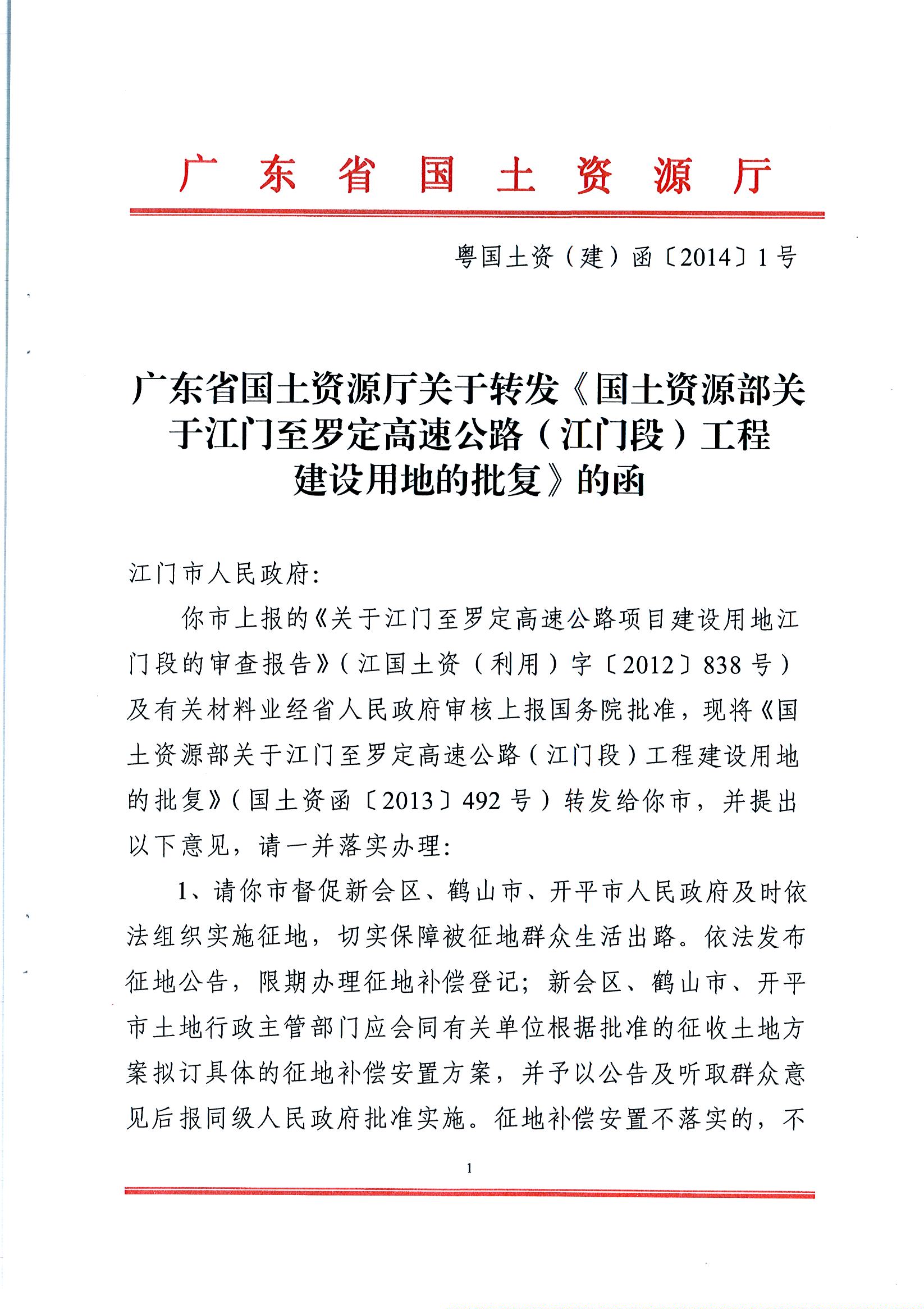 江門至羅定高速公路(江門段)工程建設(shè)用地的批復(fù)