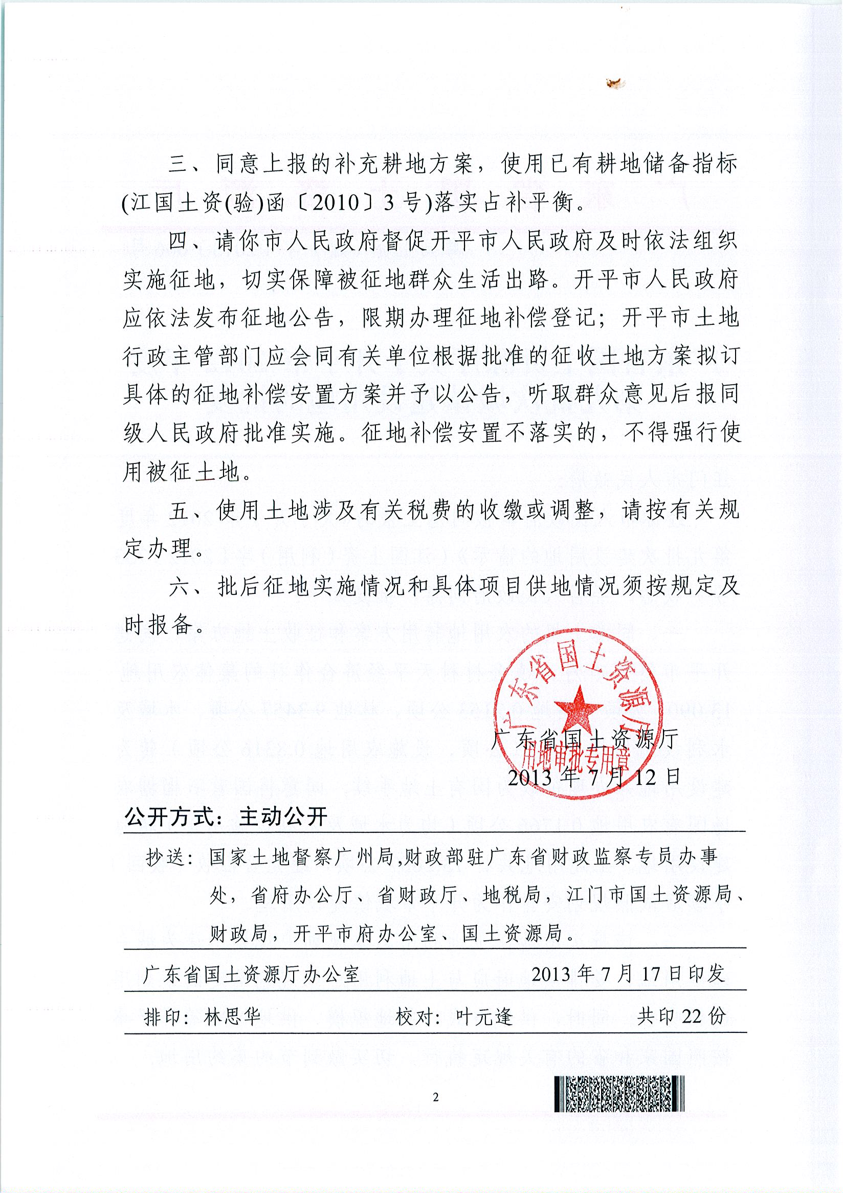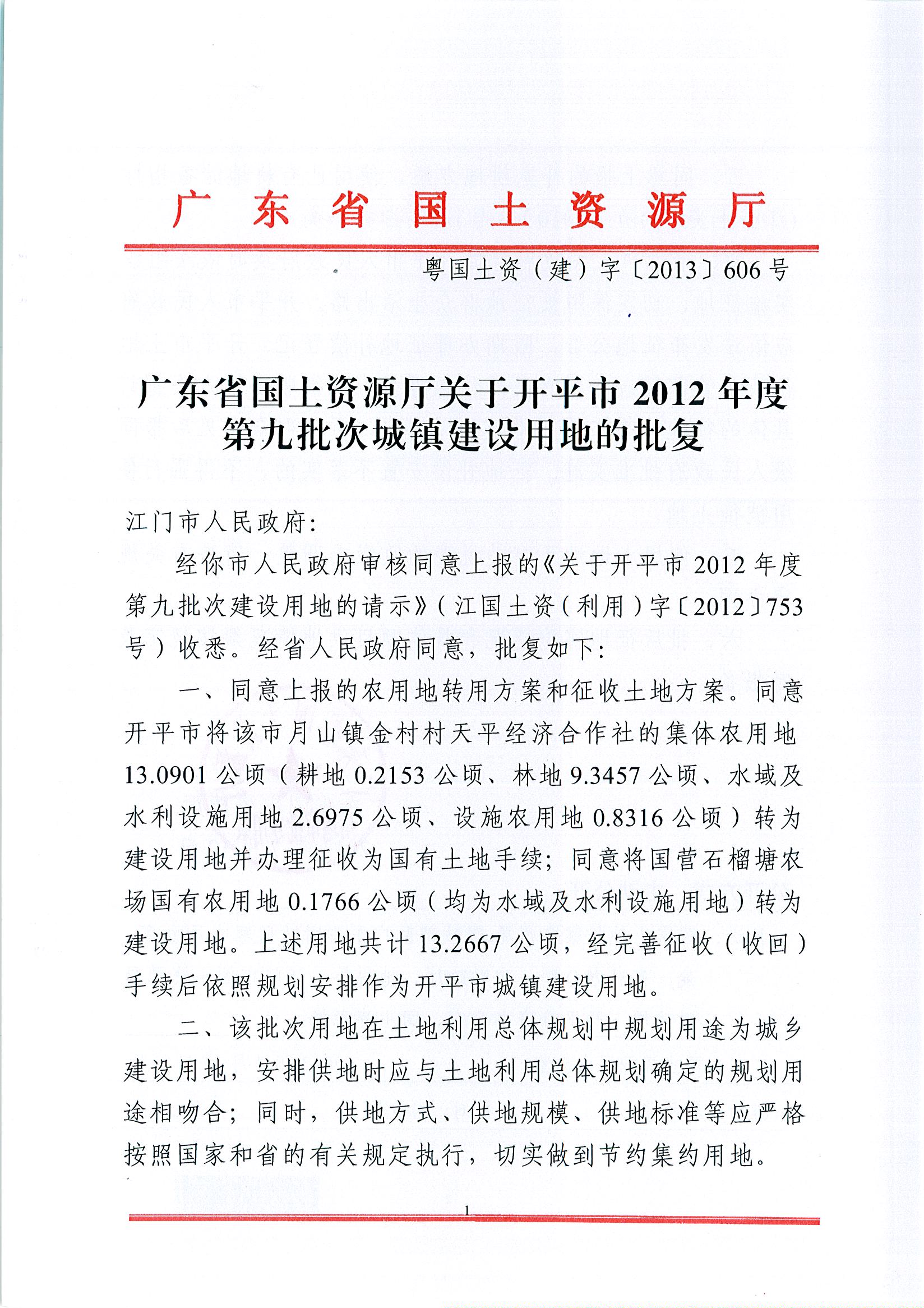 開平市2012年度第九批次城鎮(zhèn)建設(shè)用地的批復(fù)