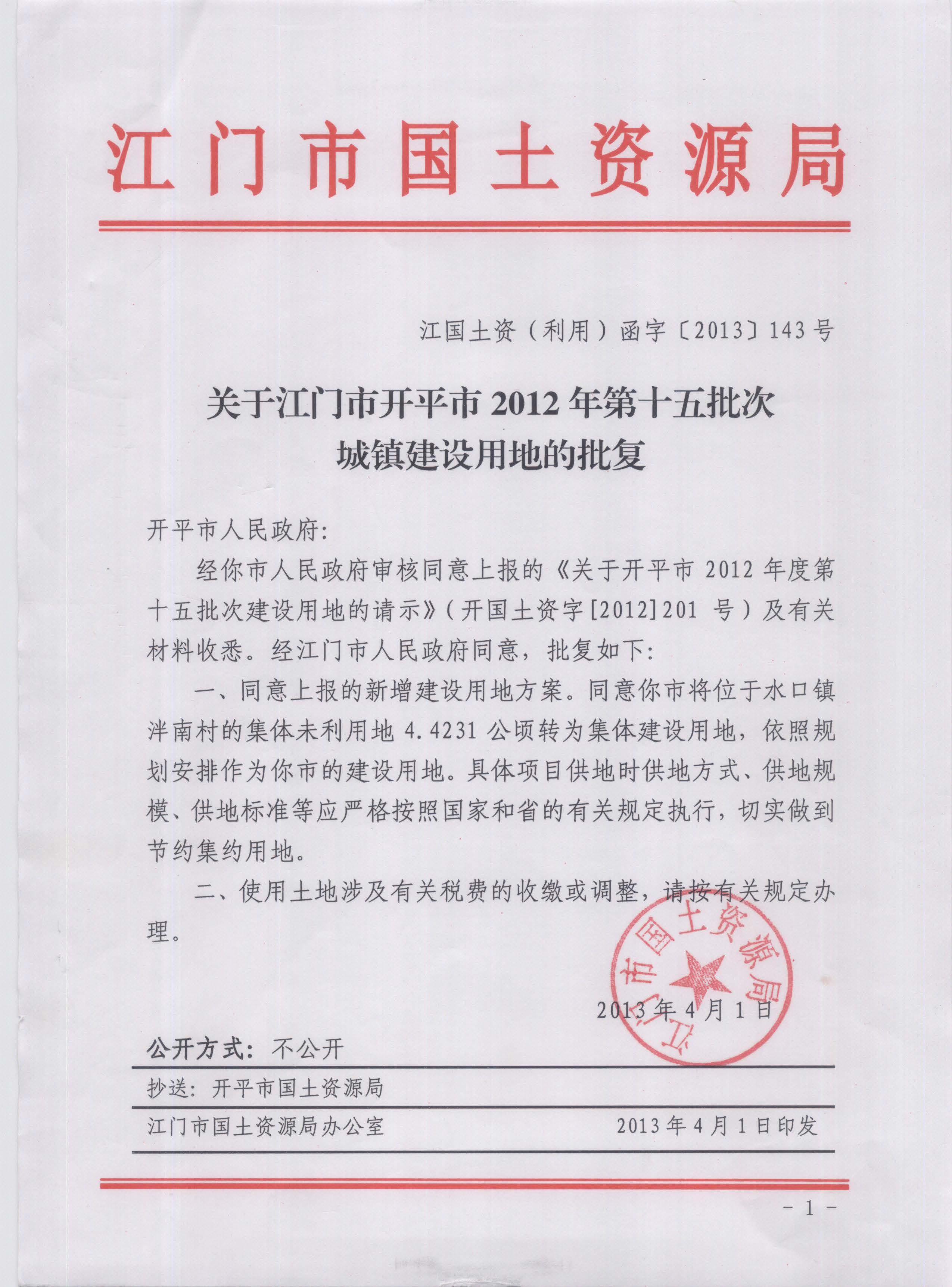 開平市2012年度第十五批次城鎮(zhèn)建設(shè)用地的批復(fù)