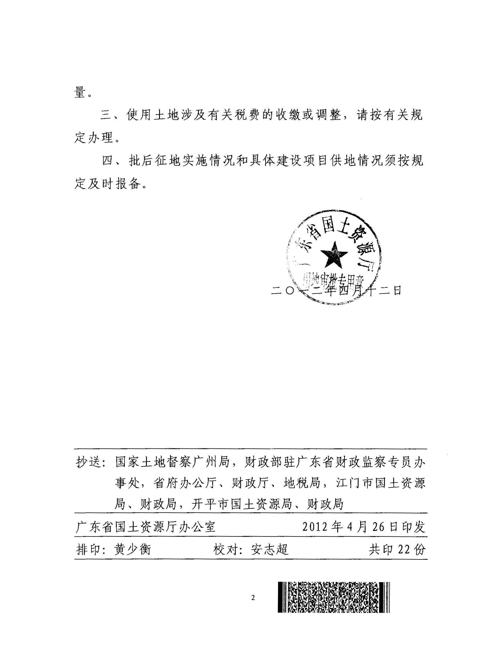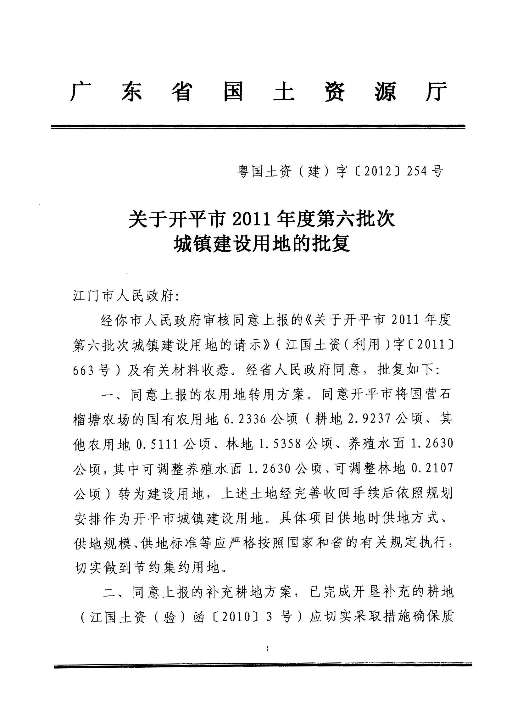 開平市2011年度第六批次城鎮(zhèn)建設(shè)用地的批復(fù)