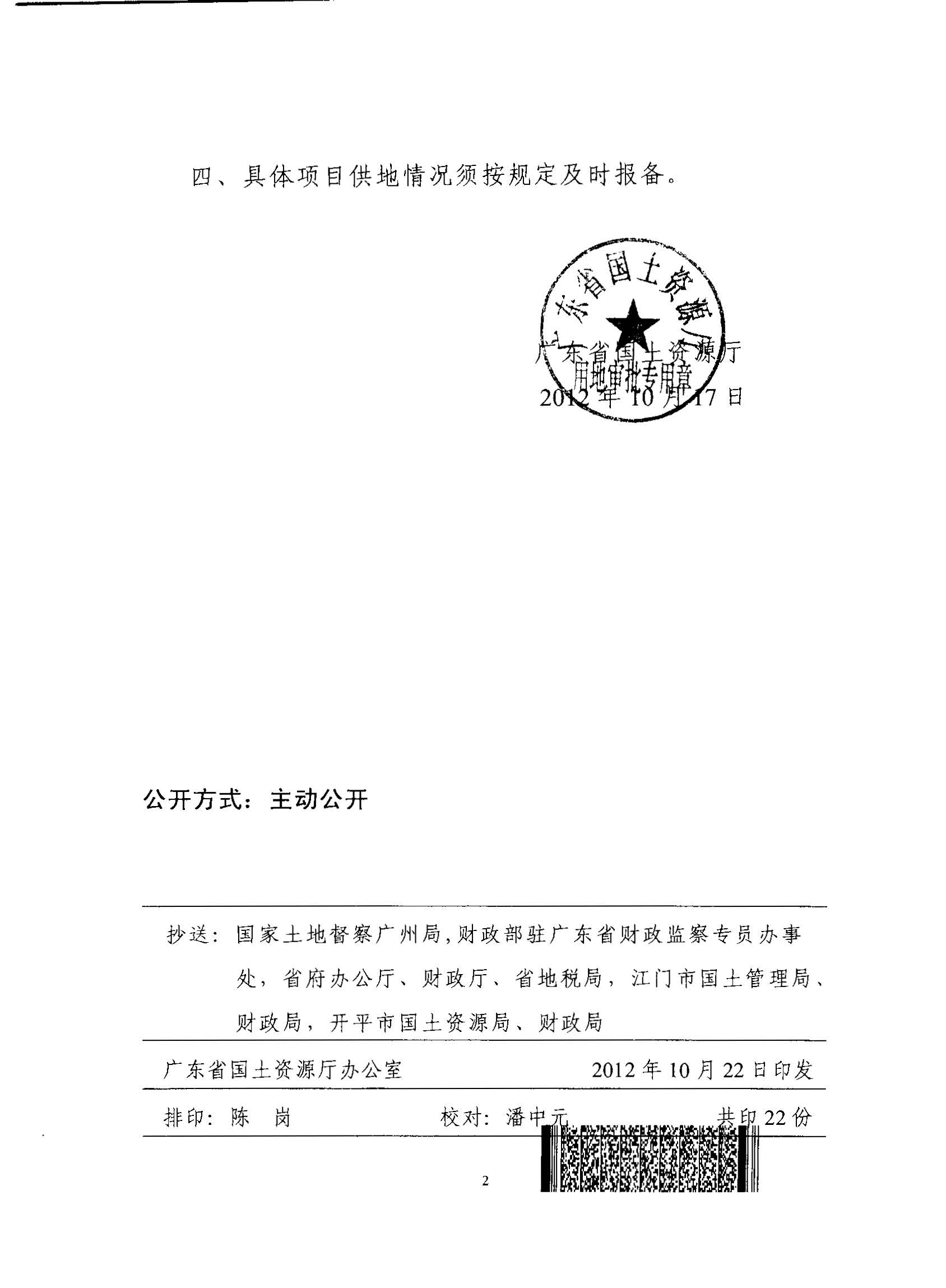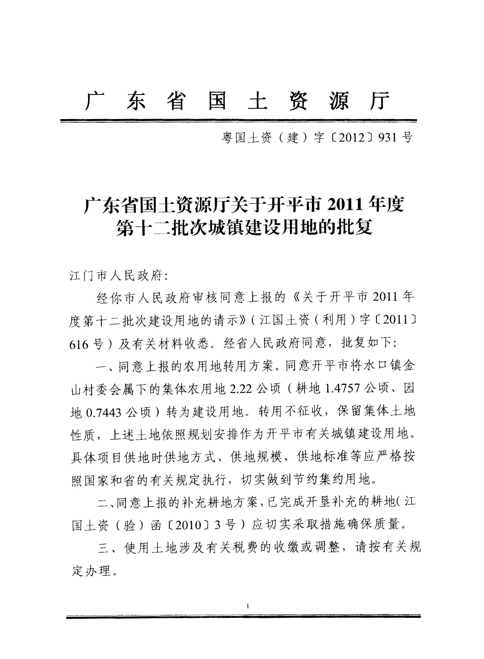 開平市2011年度第十二批次城鎮(zhèn)建設用地的批復