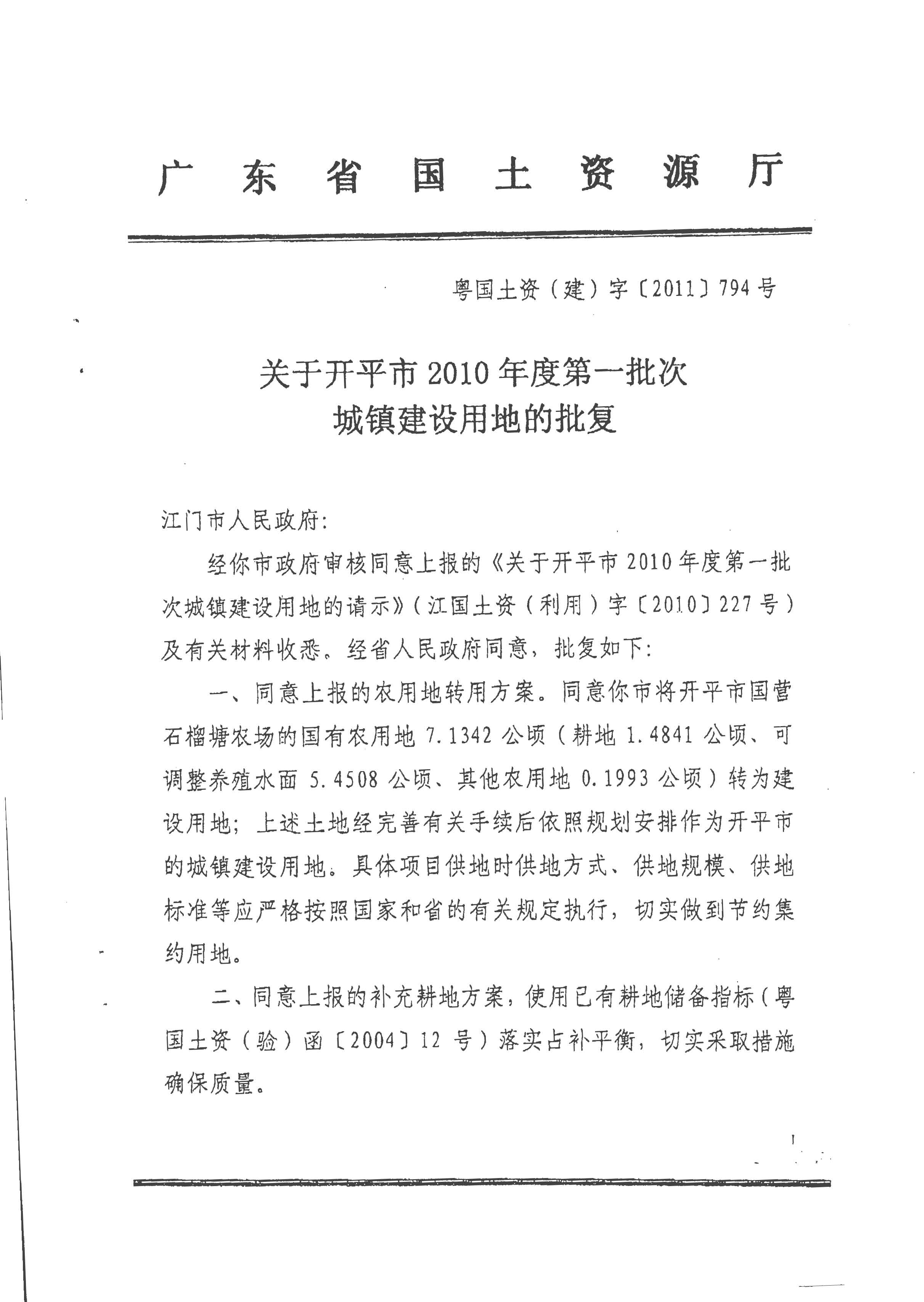 開平市2010年度第一批次城鎮(zhèn)建設(shè)用地的批復(fù)