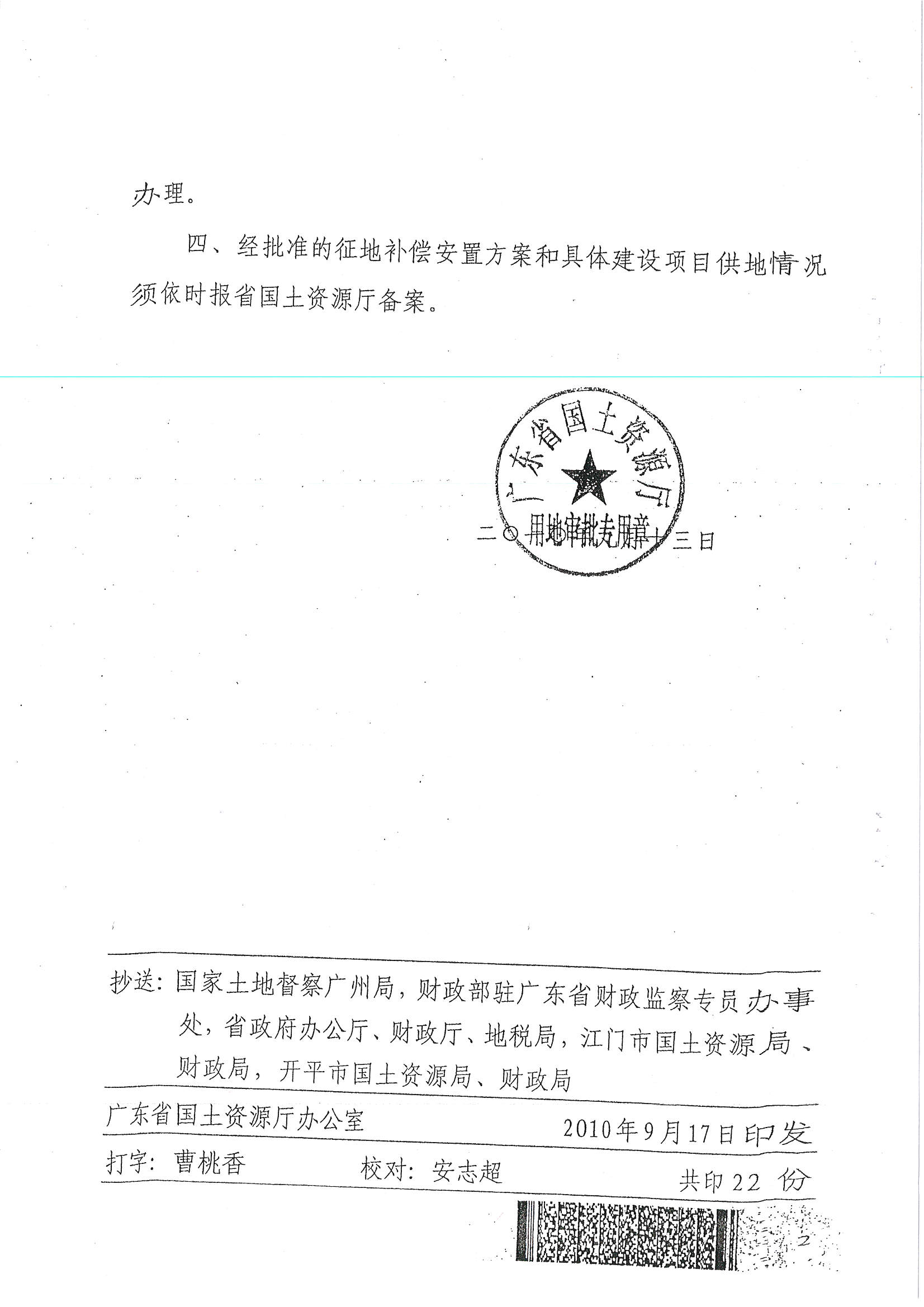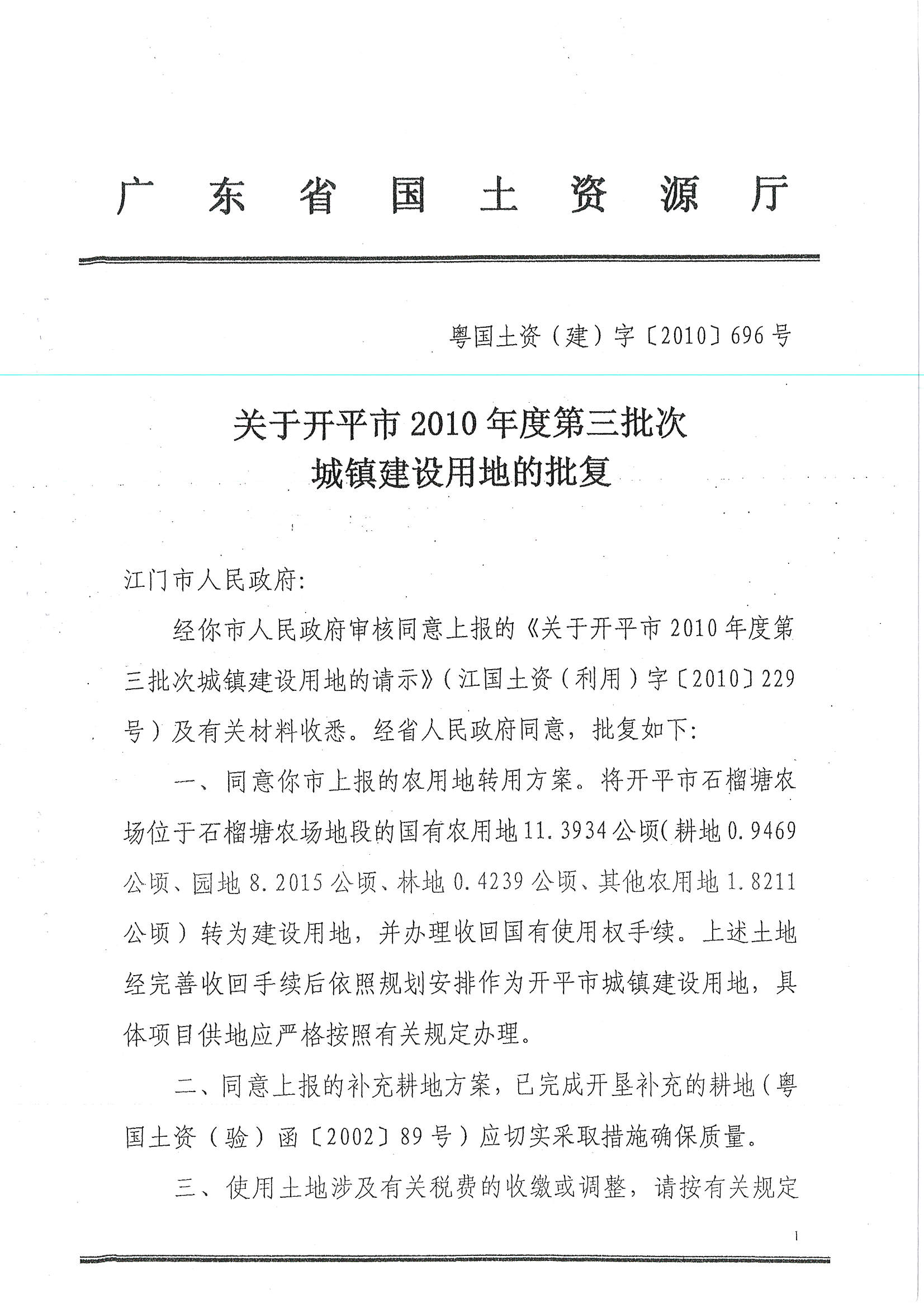 開(kāi)平市2010年度第三批次城鎮(zhèn)建設(shè)用地的批復(fù)