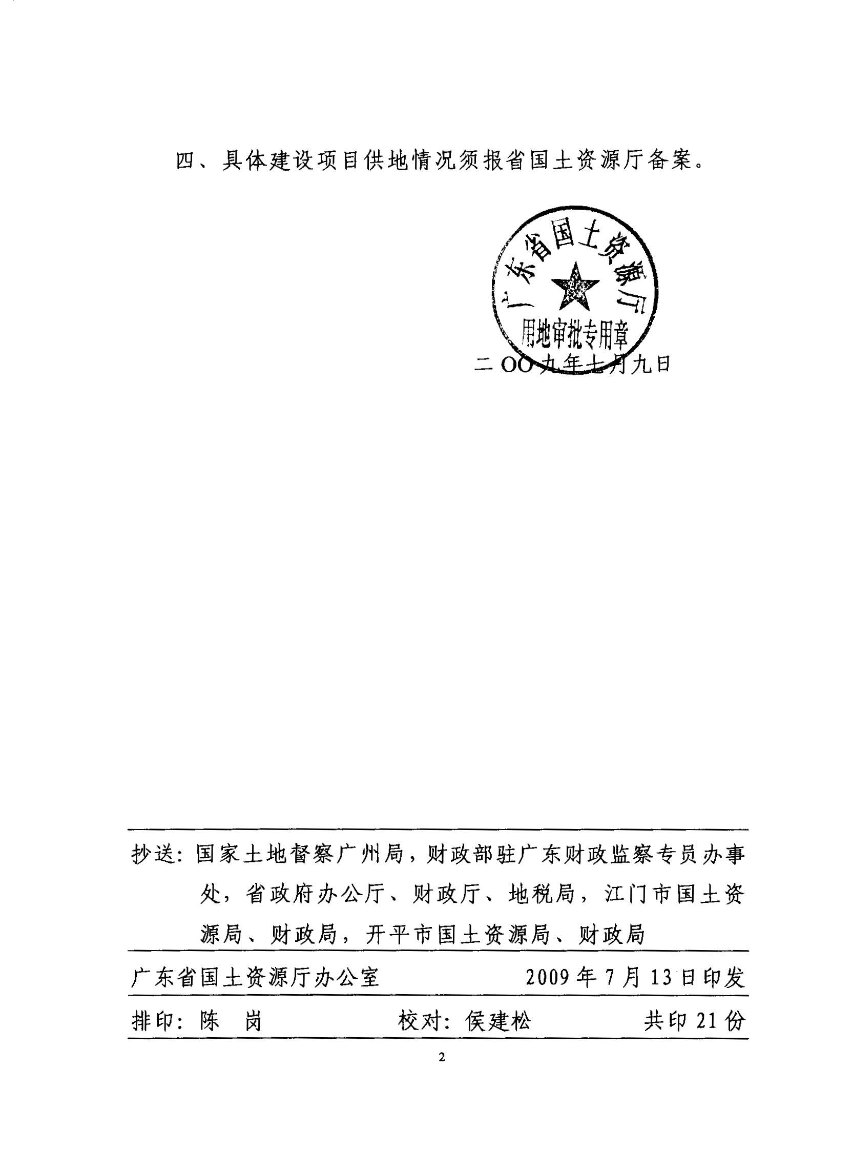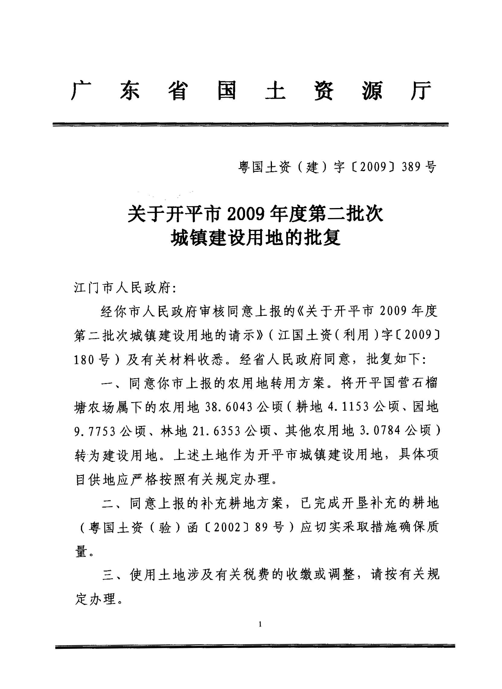 開平市2009年度第二批次城鎮(zhèn)建設(shè)用地的批復(fù)
