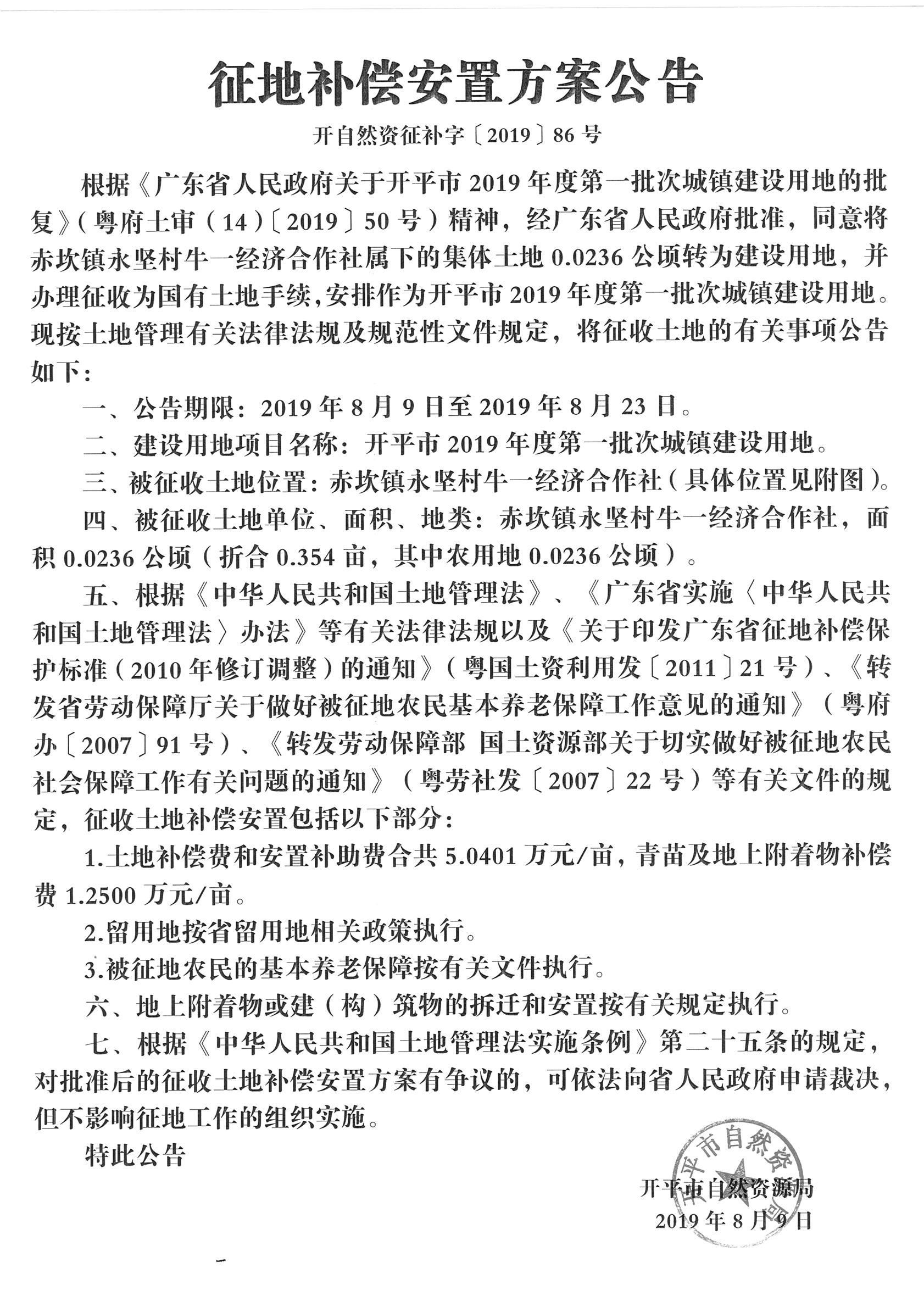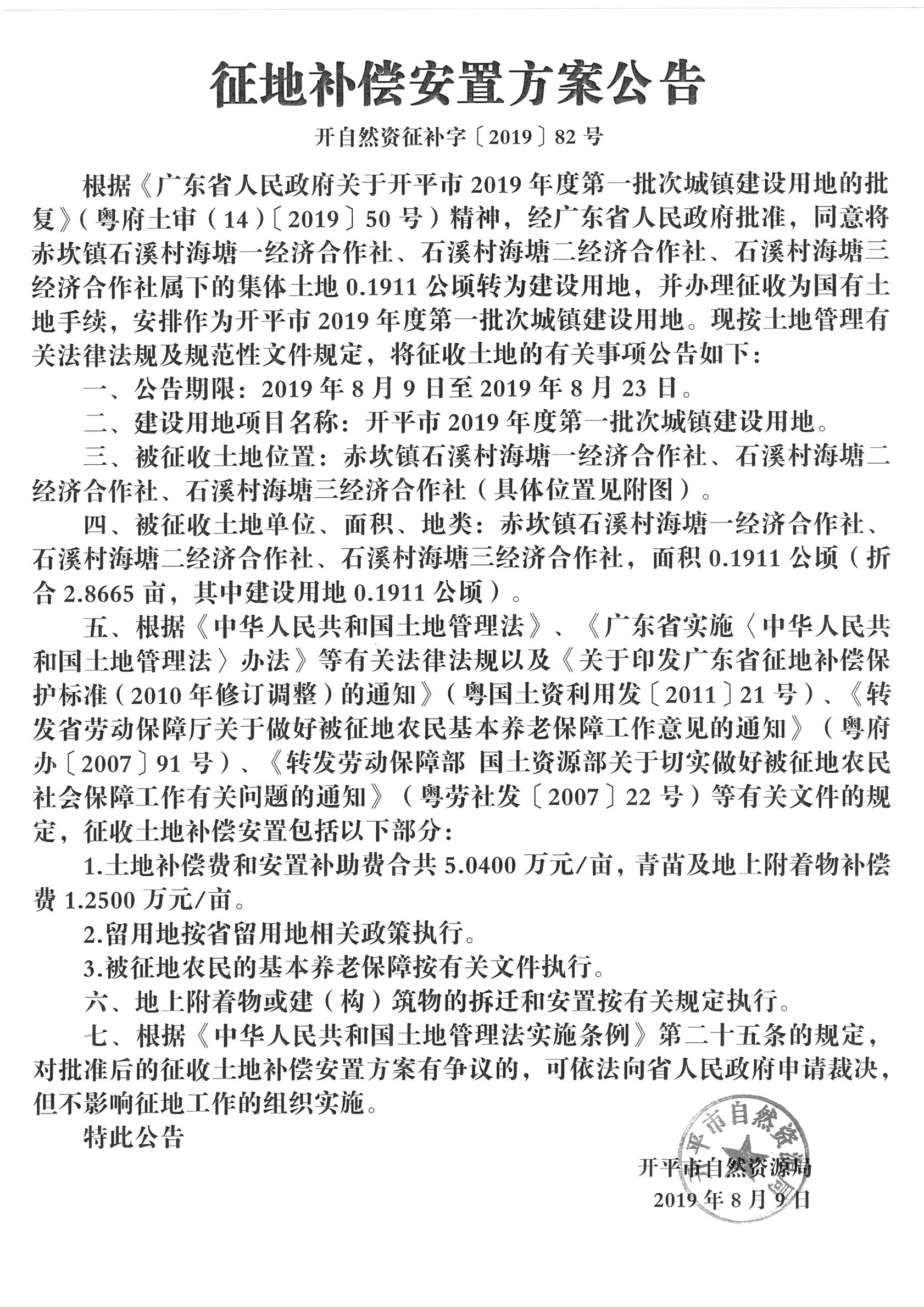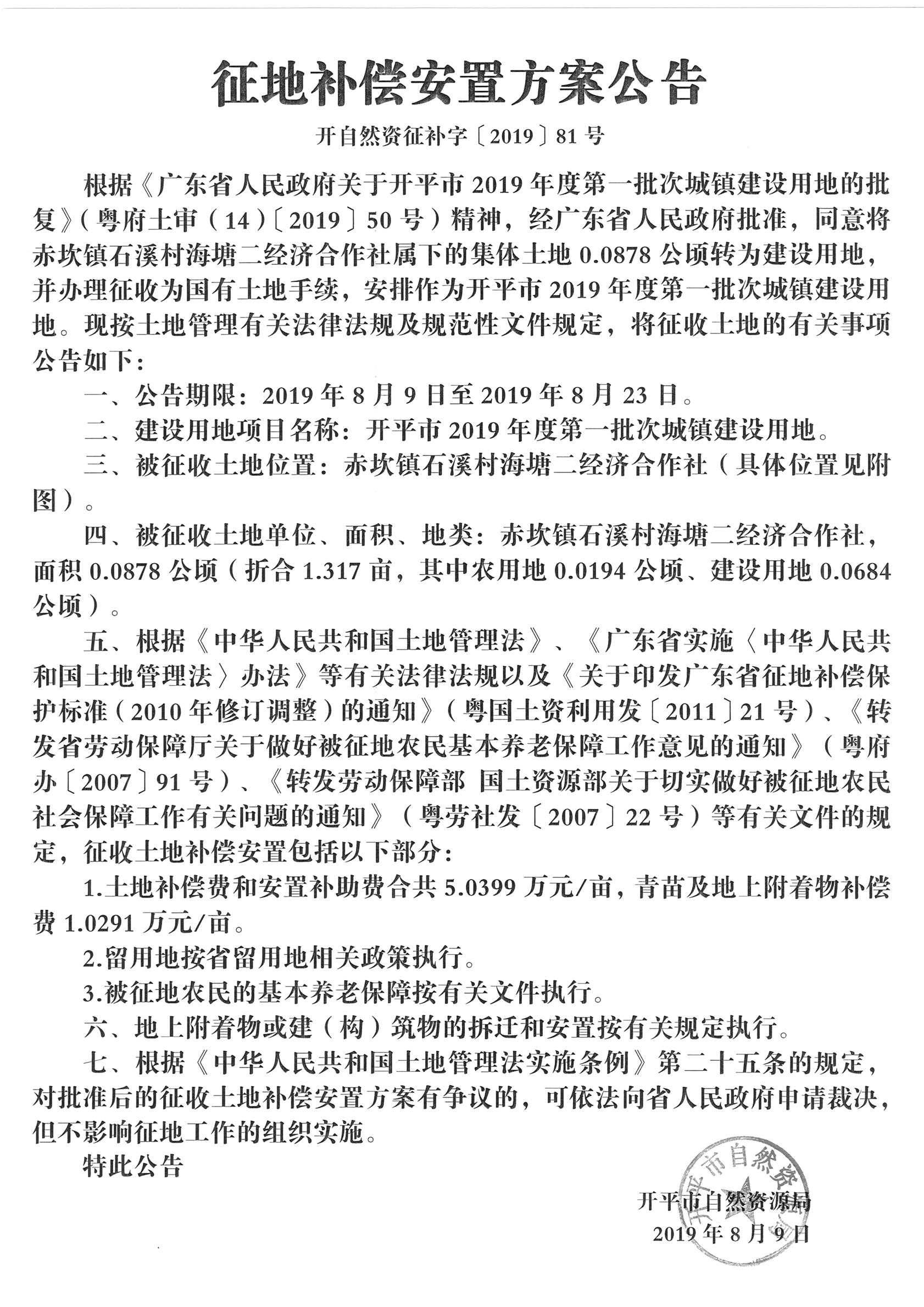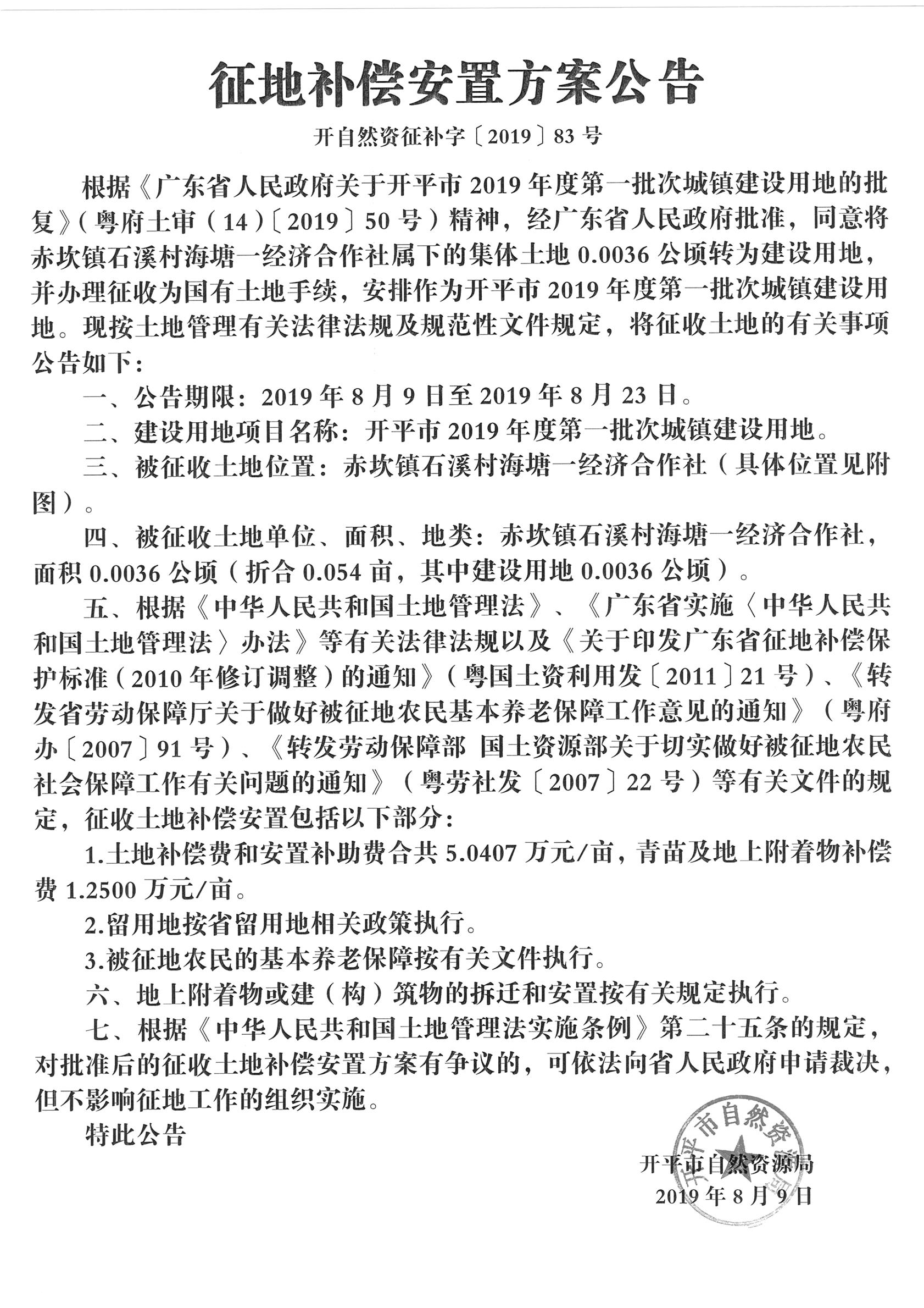 征地補償安置方案公告(開平市2019年度第一批次城鎮(zhèn)建設(shè)用地)