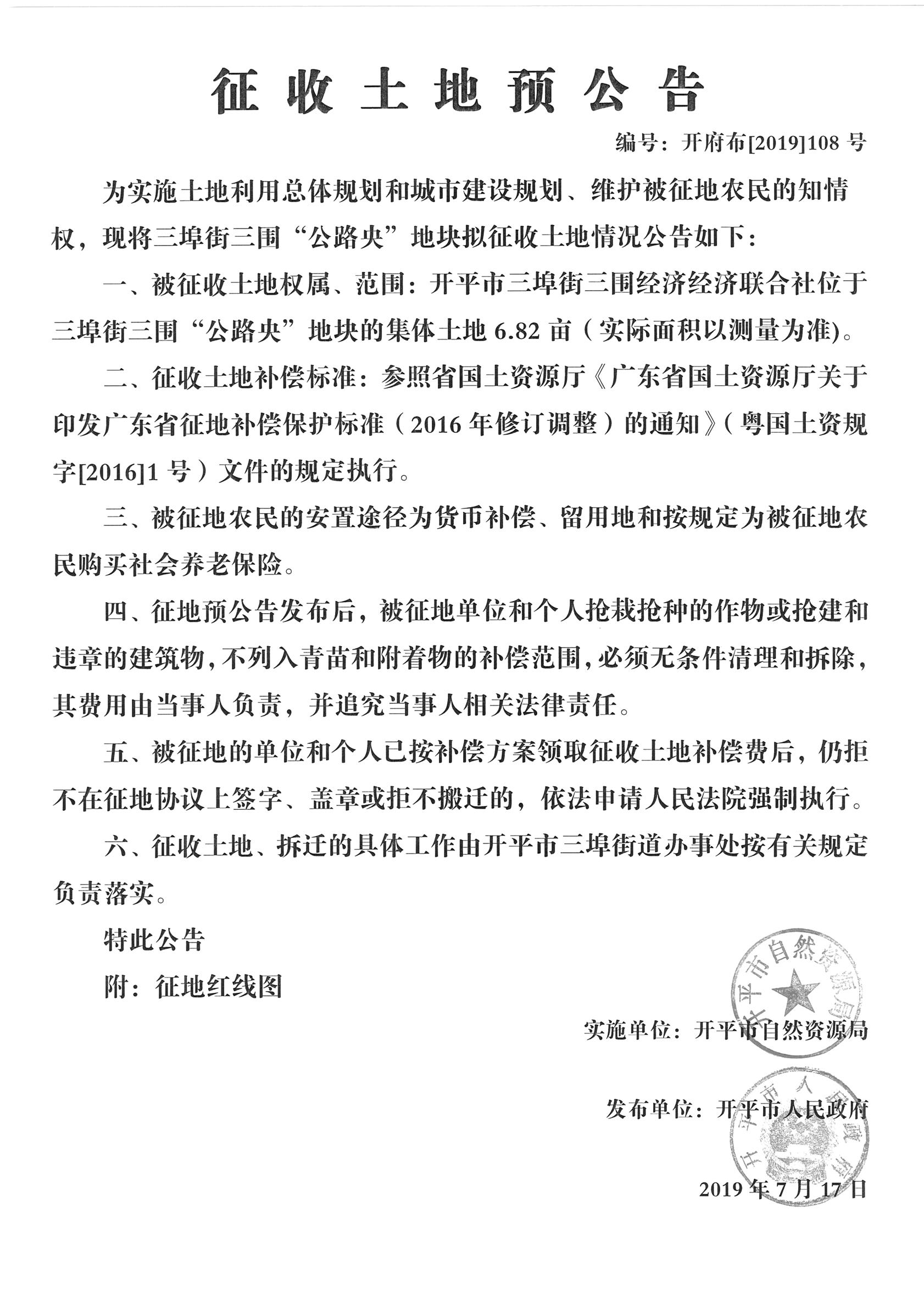 三埠街三圍“公路央”地塊征收土地預(yù)公告