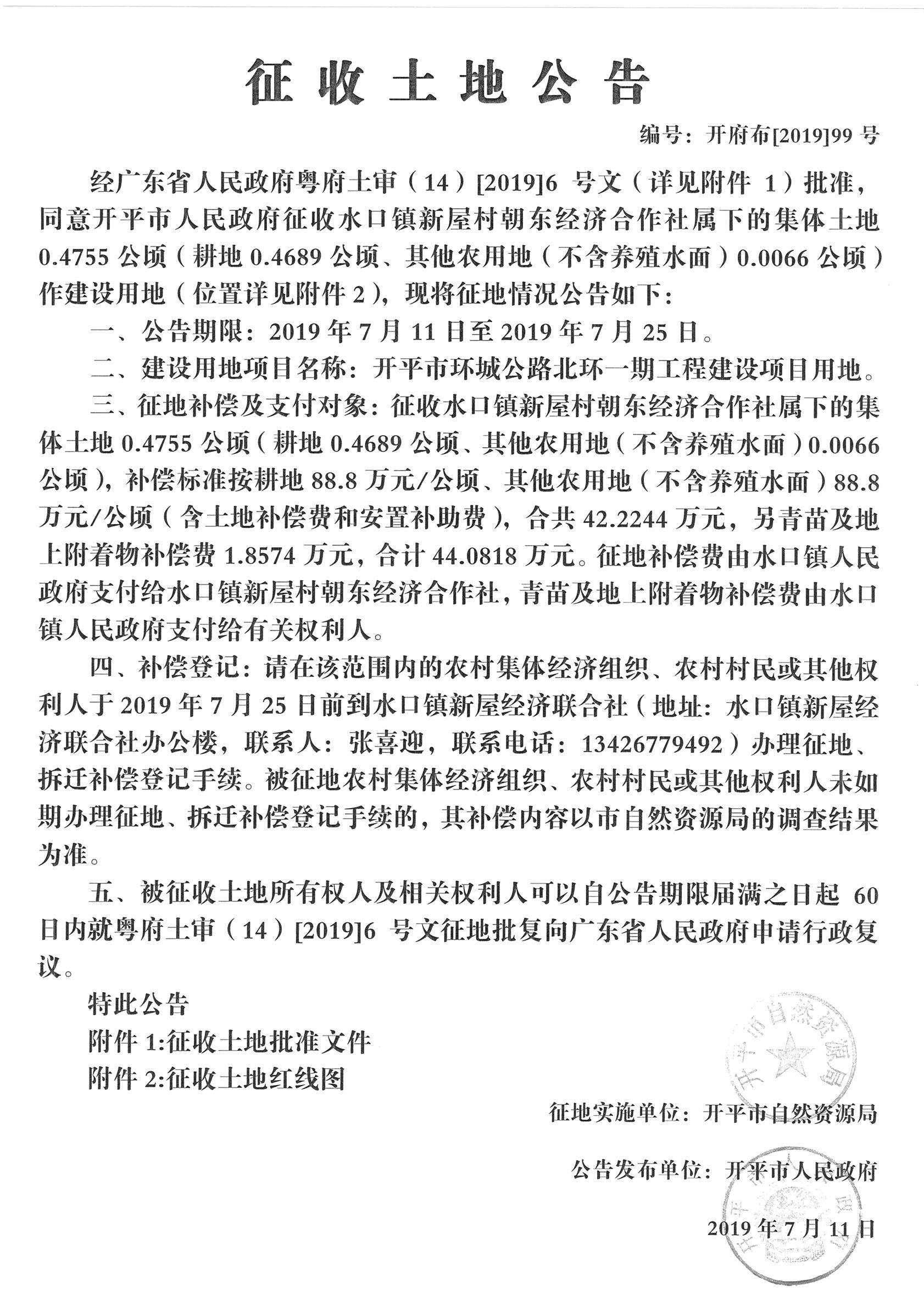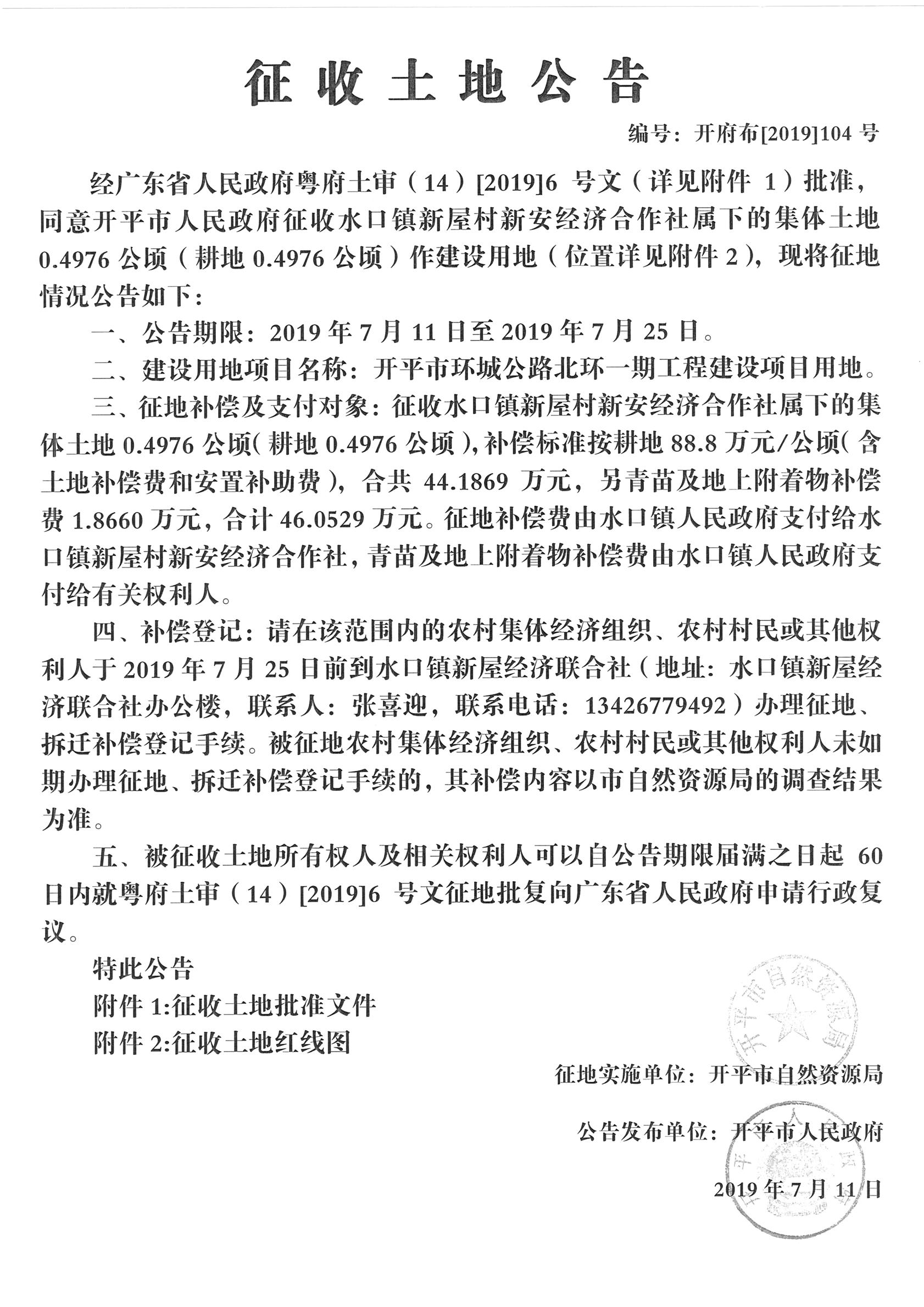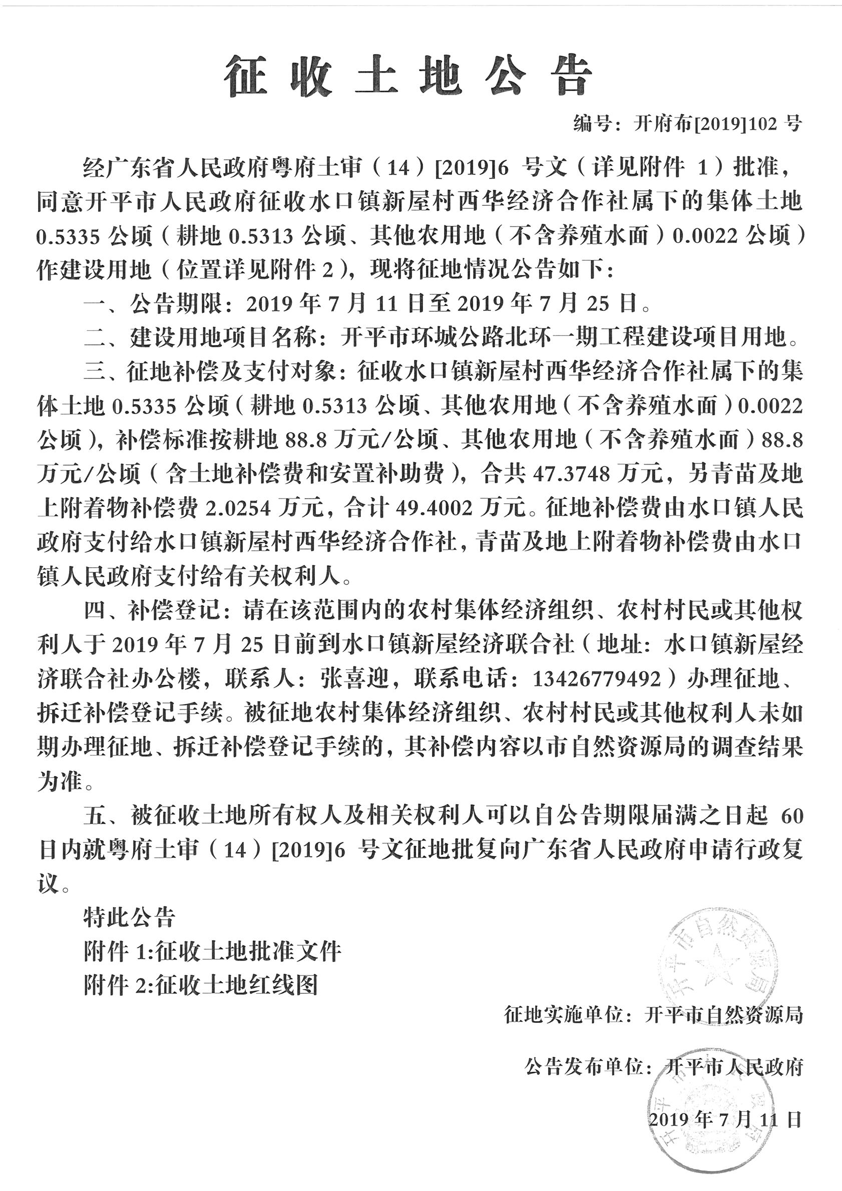 征收土地公告(開平市環(huán)城公路北環(huán)一期工程建設(shè)項目用地)