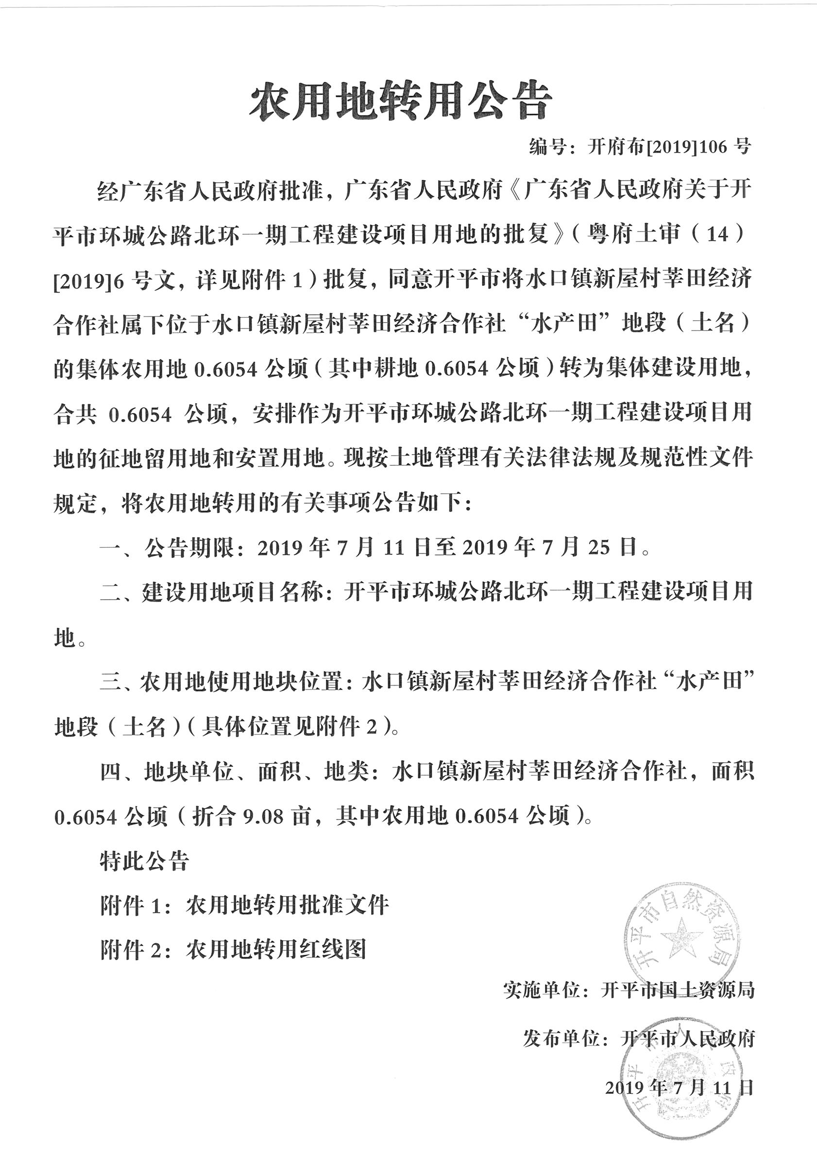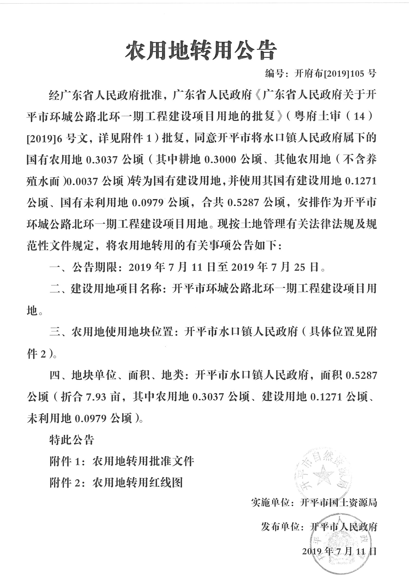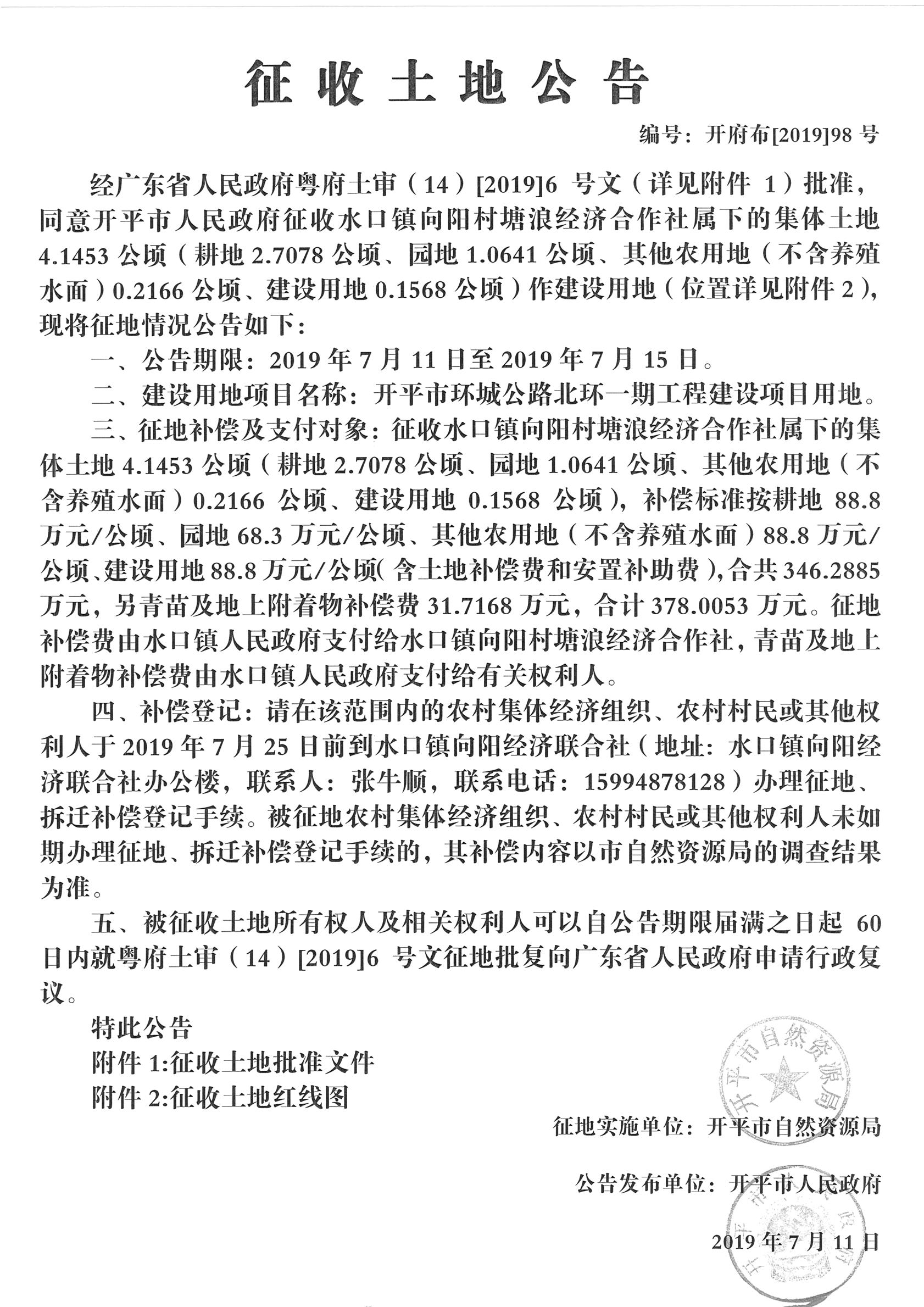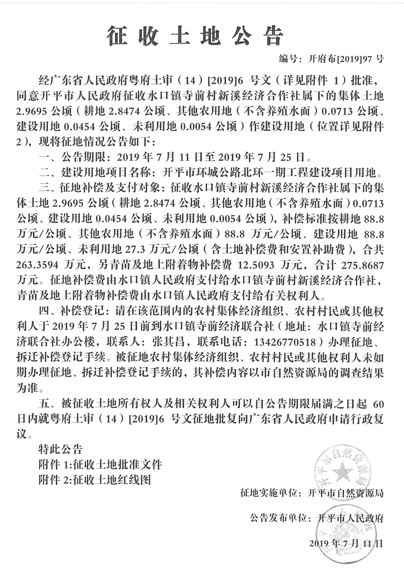 征收土地公告(開平市環(huán)城公路北環(huán)一期工程建設(shè)項目用地)