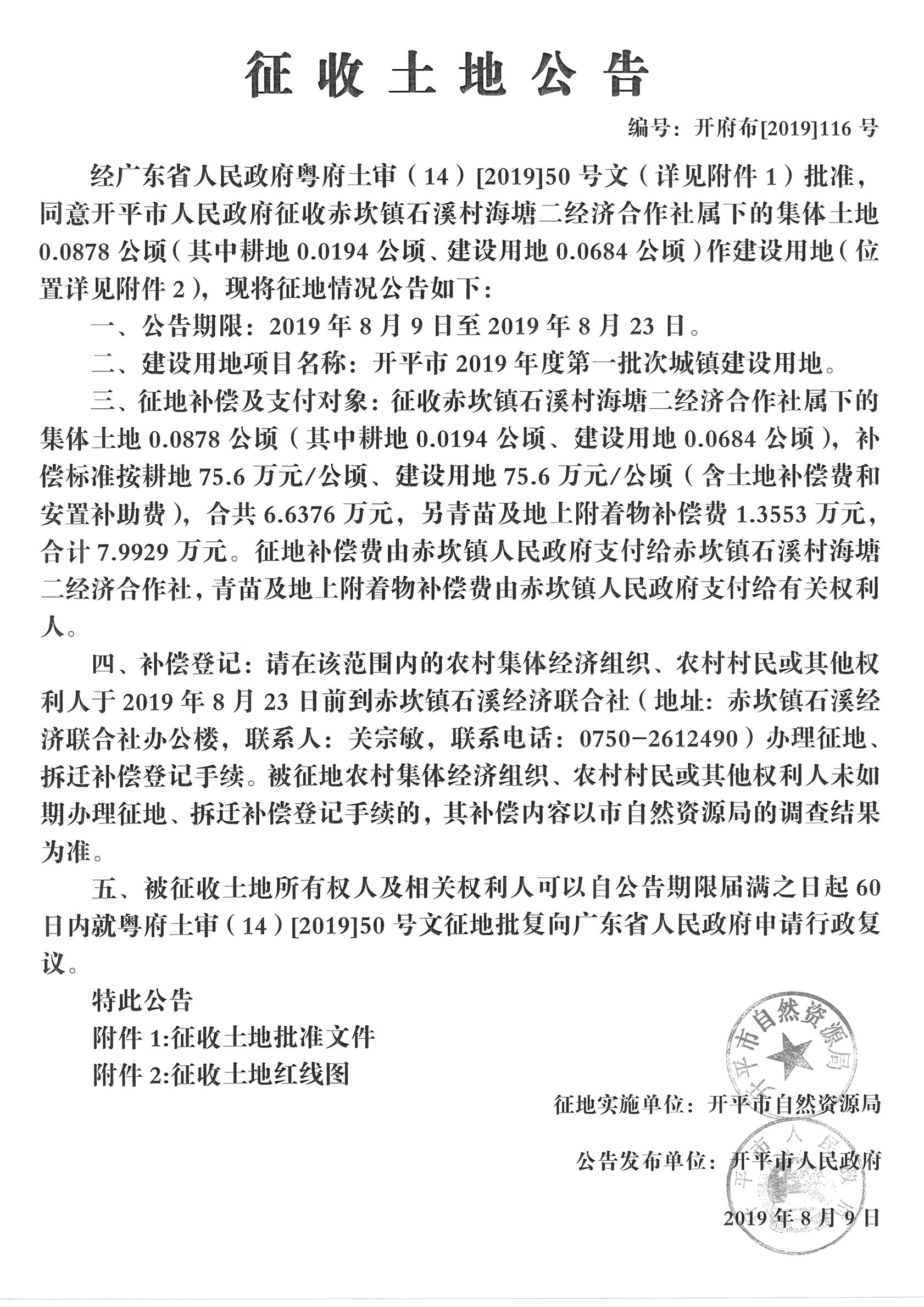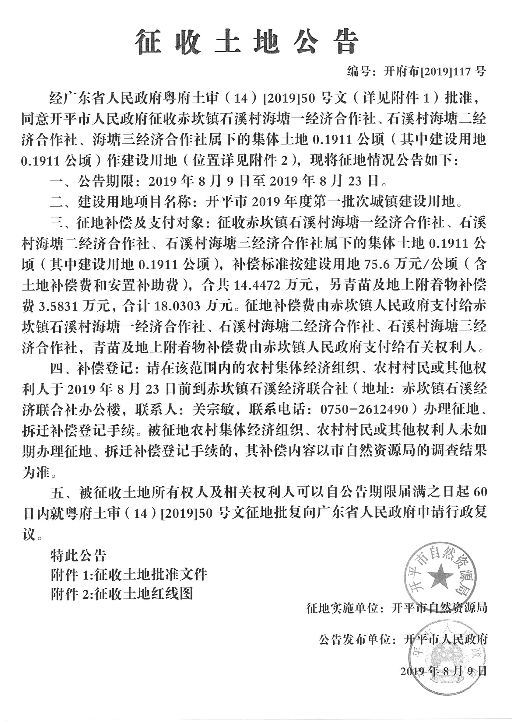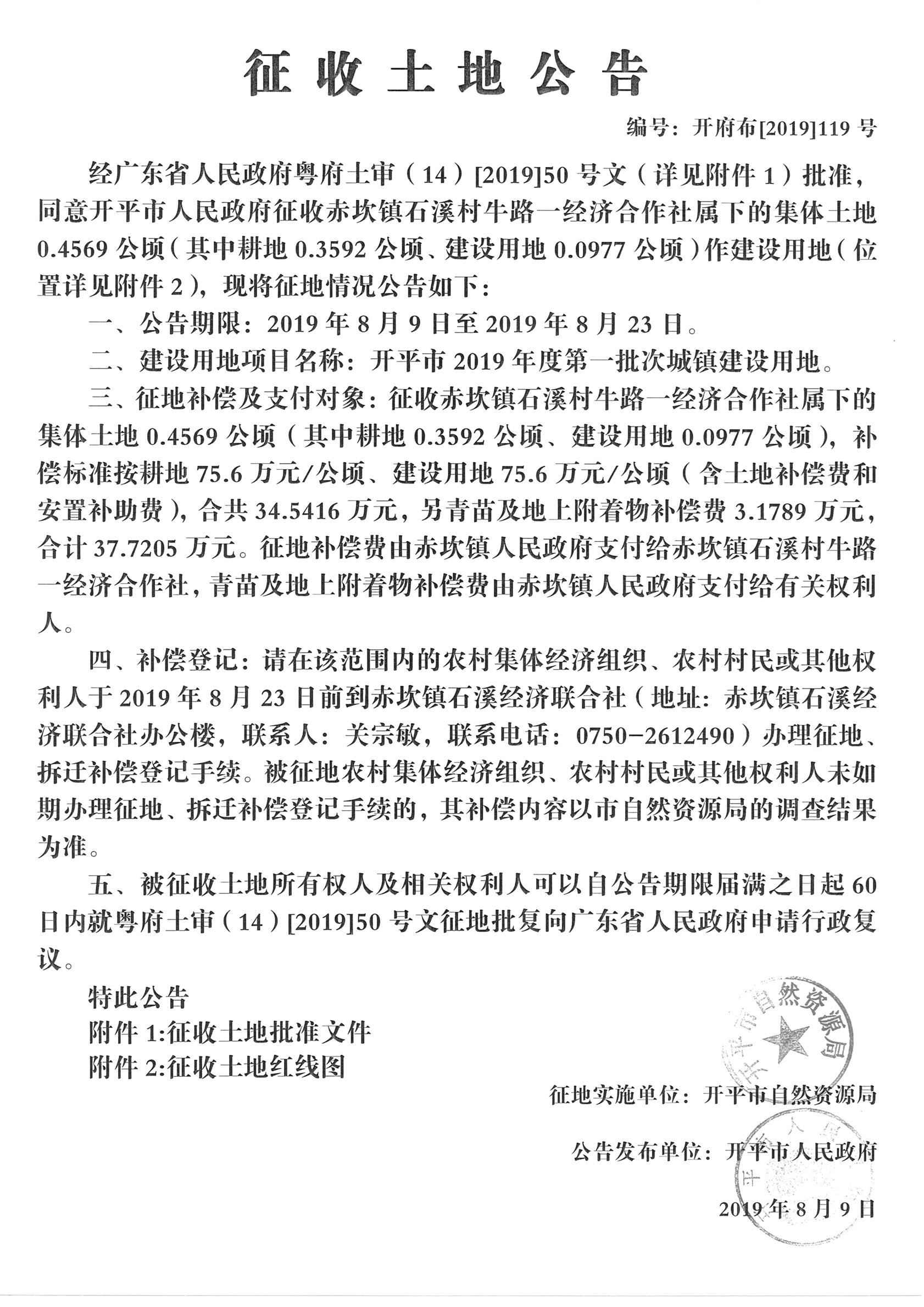 征收土地公告(開(kāi)平市2019年度第一批次城鎮(zhèn)建設(shè)用地)