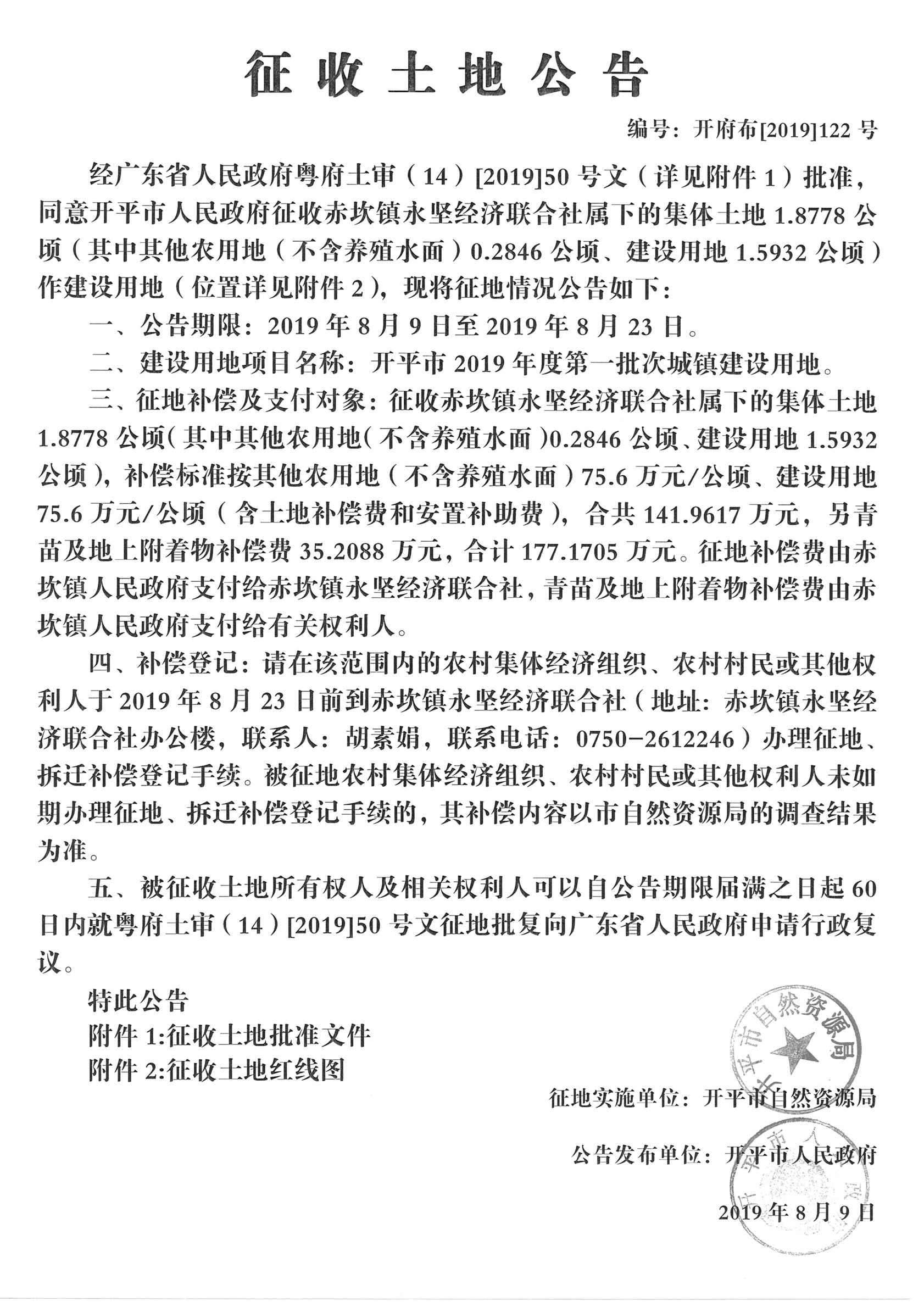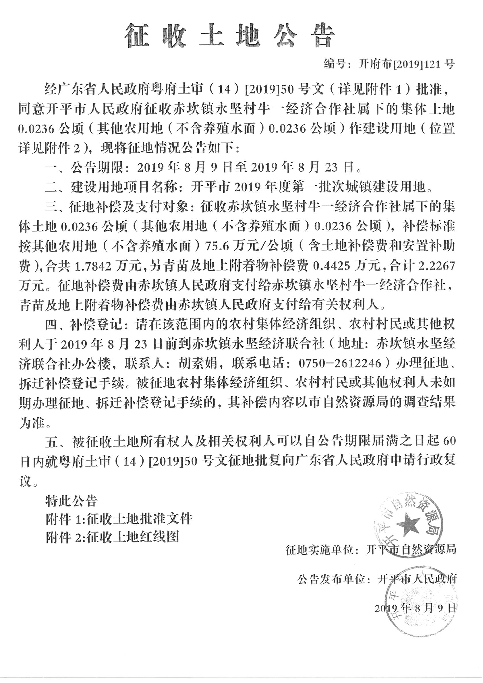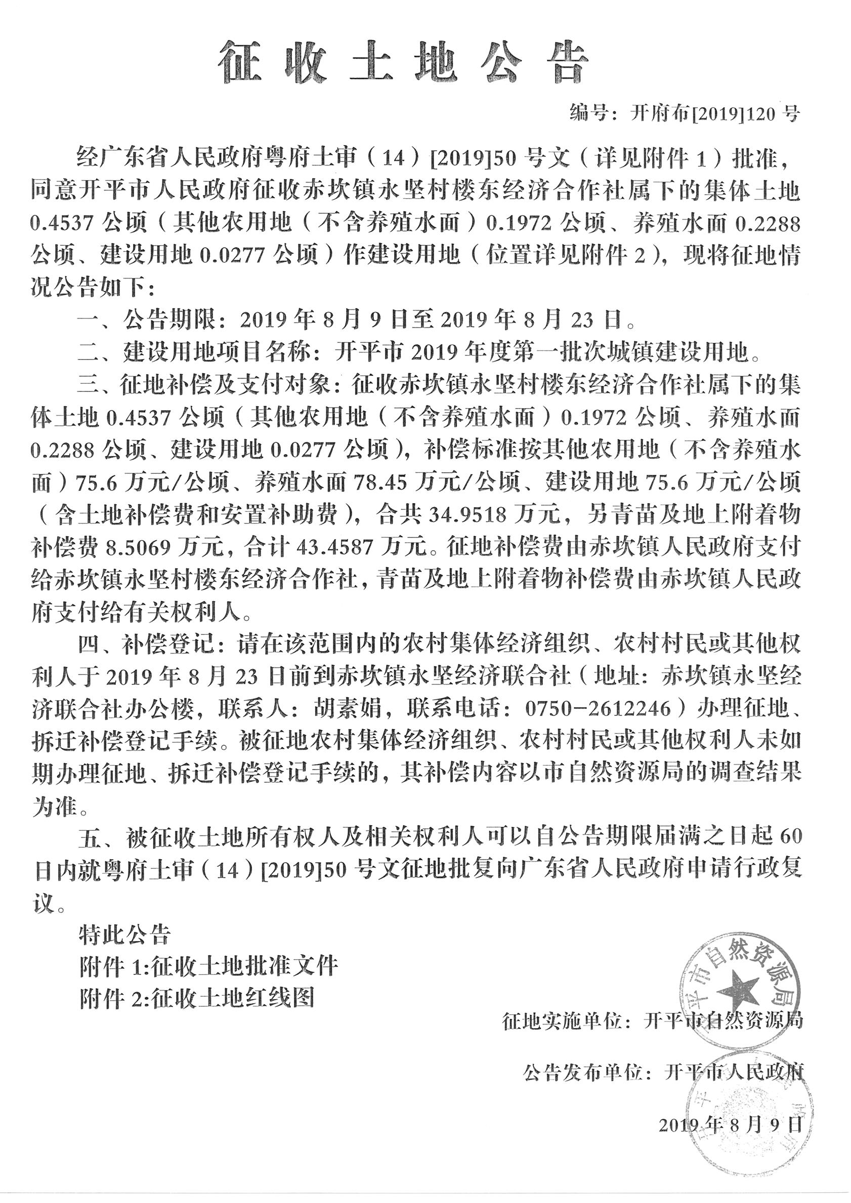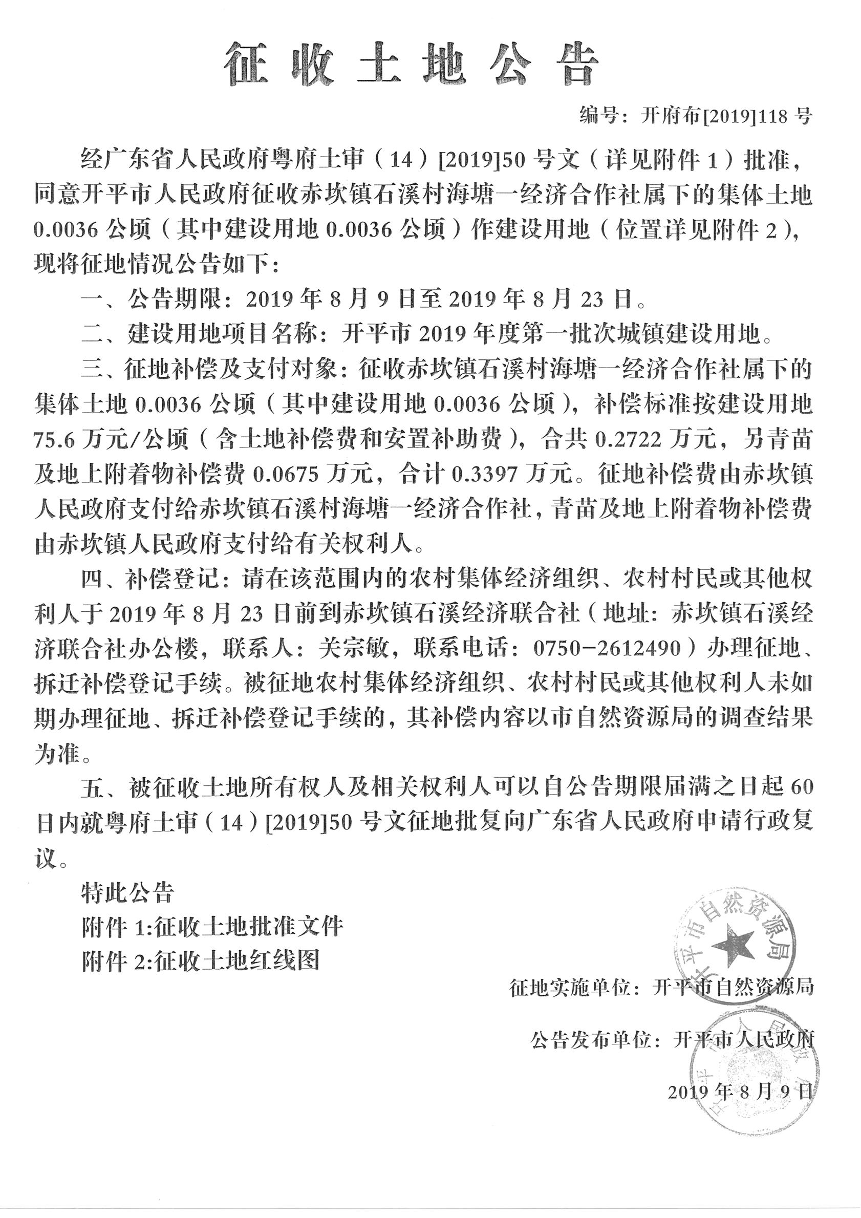 征收土地公告(開(kāi)平市2019年度第一批次城鎮(zhèn)建設(shè)用地)