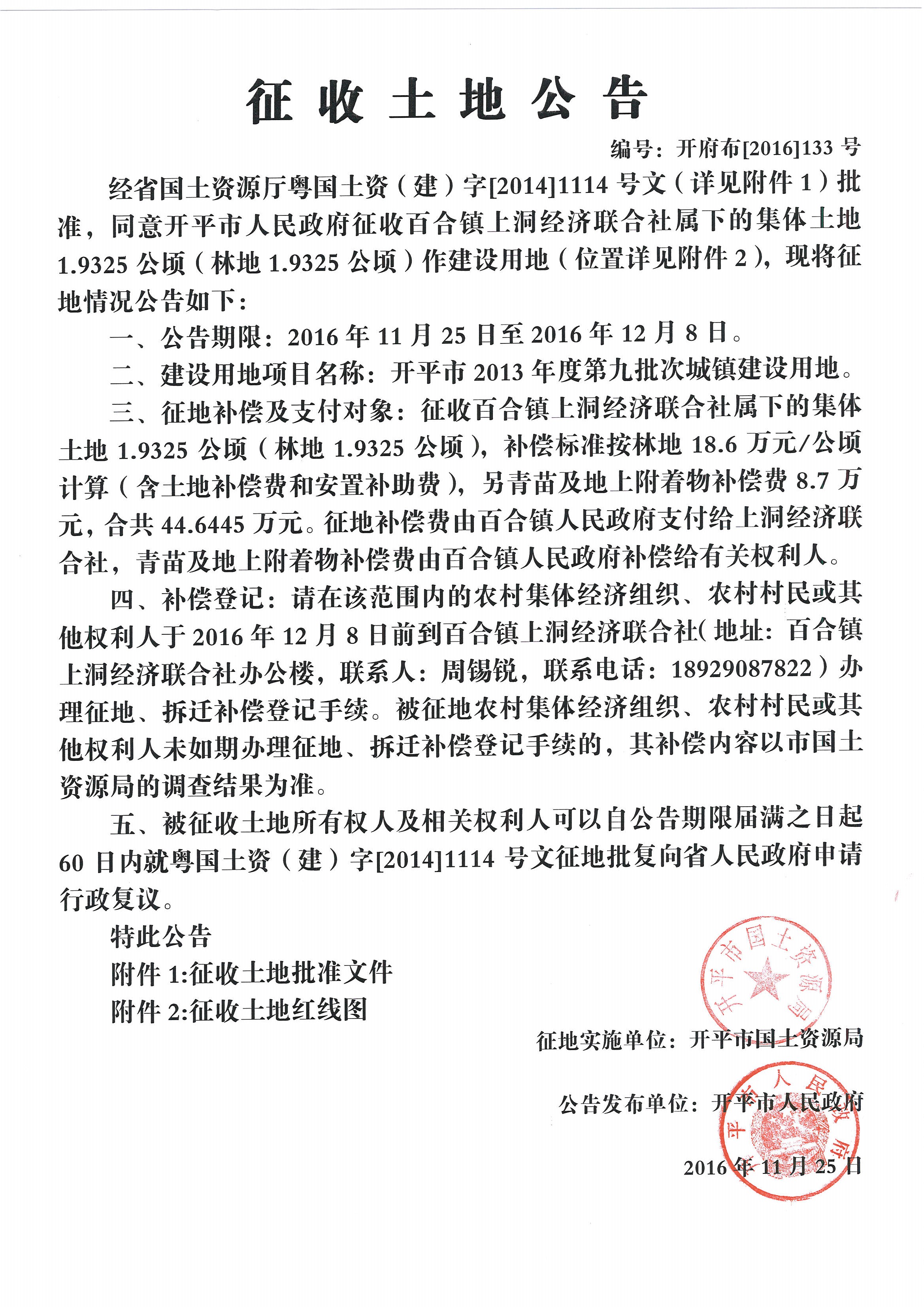 征收土地公告(開平市2013年度第九批次城鎮(zhèn)建設(shè)用地)