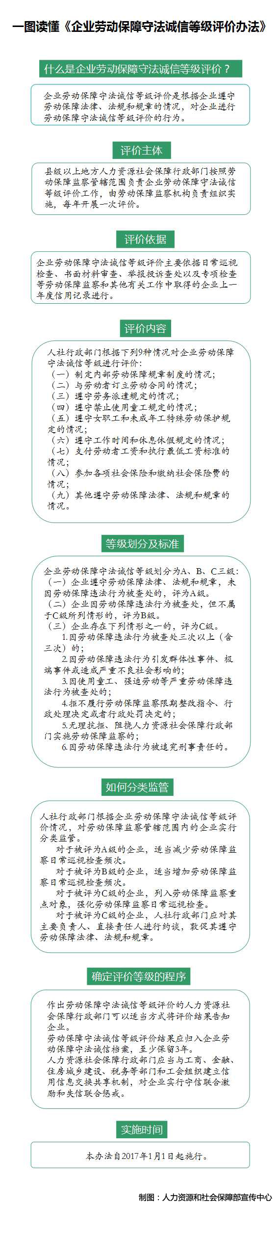 近日,人社部印發(fā)《企業(yè)勞動保障守法誠信等級評價辦法》,決定自2017年1月1日起對企業(yè)進(jìn)行勞動保障守法誠信等級評價。