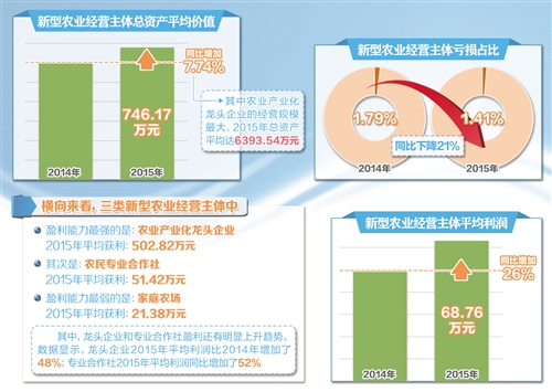 橫向來看,三類新型農(nóng)業(yè)經(jīng)營主體中,盈利能力最強(qiáng)的是農(nóng)業(yè)產(chǎn)業(yè)化龍頭企業(yè),2015年平均獲利502.82萬元。其次是農(nóng)民專業(yè)合作社,平均獲利51.42萬元;盈利能力最弱的是家庭農(nóng)場(chǎng),平均獲利21.38萬元。其中,龍頭企業(yè)和專業(yè)合作社盈利還有明顯上升趨勢(shì)。數(shù)據(jù)顯示,龍頭企業(yè)2015年平均利潤比2014年增加了48%;專業(yè)合作社2015年平均利潤同比增加了52%。
