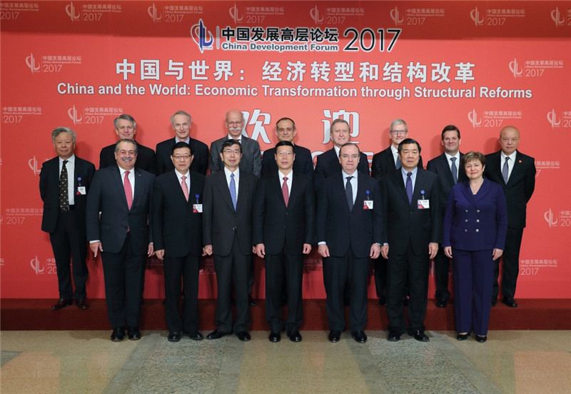 3月19日,中國(guó)發(fā)展高層論壇2017年年會(huì)在北京開(kāi)幕。中共中央政治局常委、國(guó)務(wù)院副總理張高麗出席開(kāi)幕式并致辭。這是開(kāi)幕式前,張高麗同部分與會(huì)嘉賓合影。新華社記者 王曄 攝