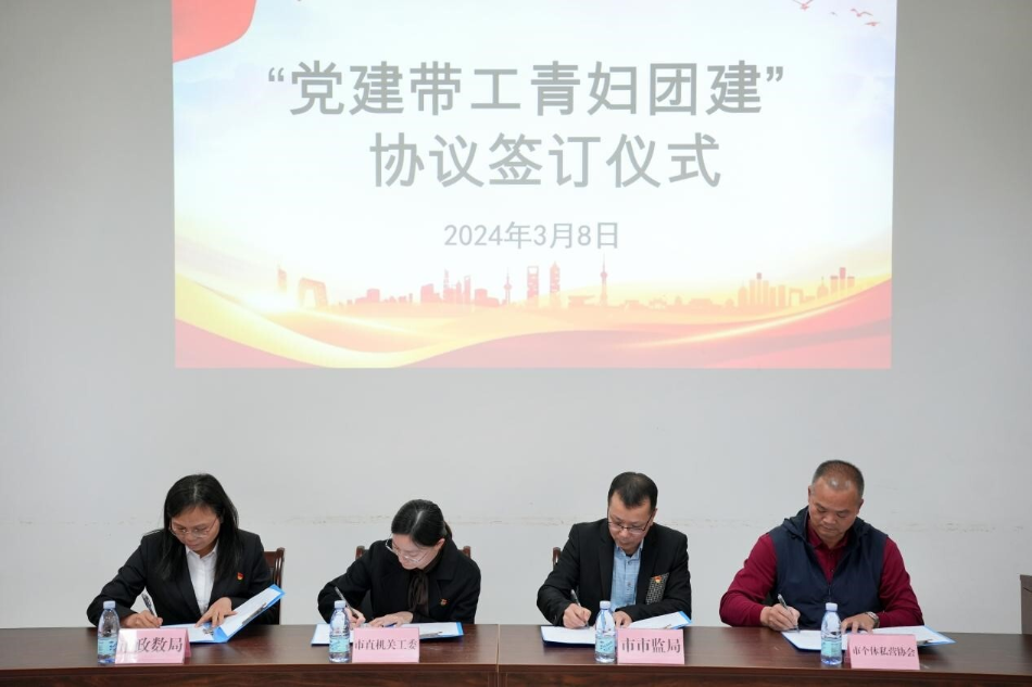 為打好黨建引領(lǐng)“組合拳”,奏響黨群工作“立體聲”,充分發(fā)揮政企優(yōu)勢互補作用,提高基層黨建工作和中心工作成效,3月8日下午,開平市直機關(guān)工委、市政數(shù)局、市市監(jiān)局、市個體私營企業(yè)協(xié)會舉行簽約儀式,共同簽署《黨建帶工青婦團建活動協(xié)議書》。 協(xié)議簽署后,四家單位將本著以黨建聚合工青婦力量,夯實黨建引領(lǐng)作用的原則,通過團建活動平臺、分享工作資源、交流工作經(jīng)驗、解決實際問題,在筑牢組織基礎(chǔ)、團結(jié)隊伍建設(shè)、共辦實事好事、同謀四方發(fā)展等方面,著力提升改革攻堅質(zhì)量,以“黨建引領(lǐng)促服務