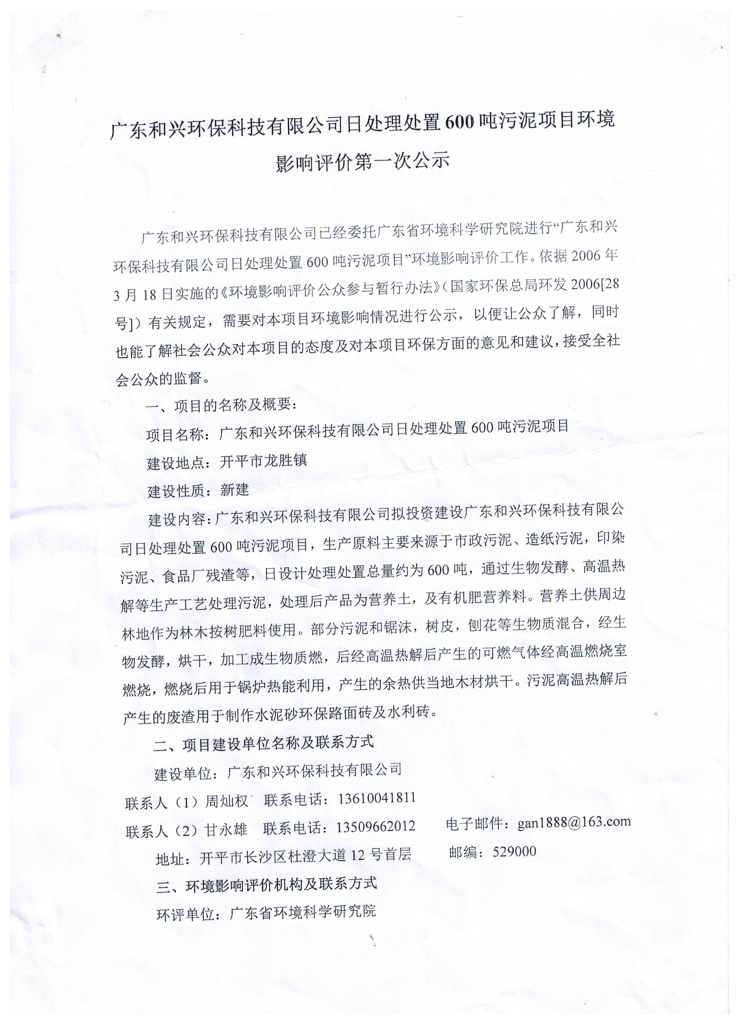 廣東和興環(huán)??萍加邢薰救仗幚?00噸污泥項目環(huán)境影響評價第一次公示